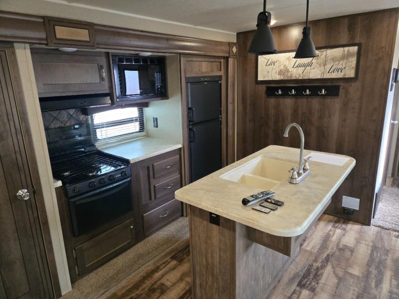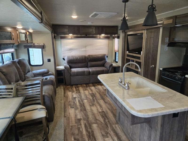 How does a triple slide travel trailer with a rear living layout, front master bedroom, and a kitchen island sound to you? Take a look inside the Palomino Puma model 31-RLQS today to see what all you have been waiting for.