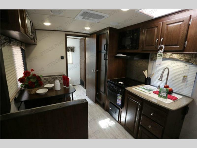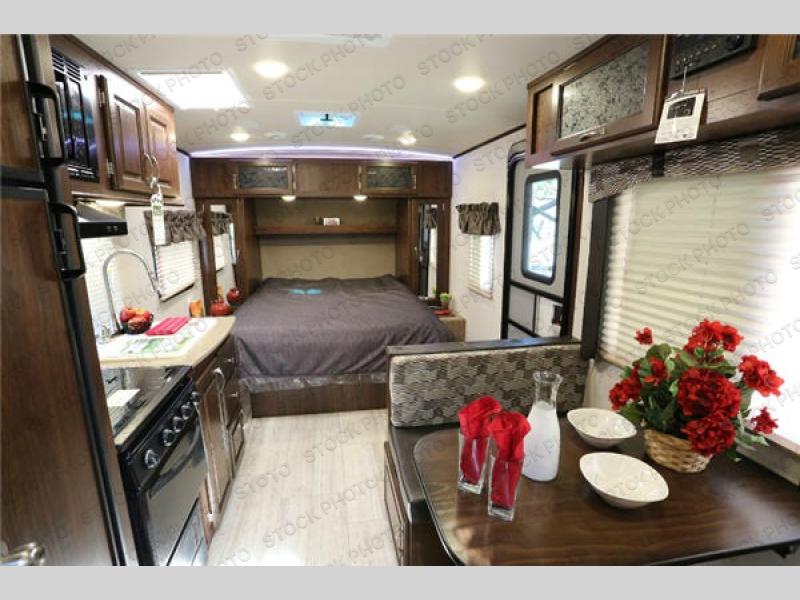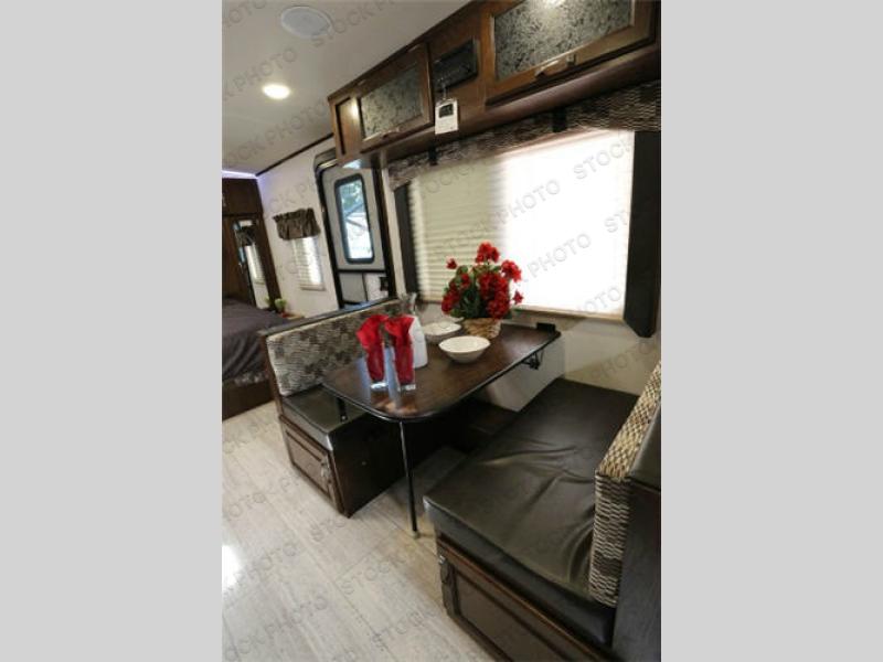 To your immediate left inside the entry door you will find a 38" x 72" booth dinette with storage overhead, and beneath both bench seats. This is handy for your larger items, games, and other camping extras.