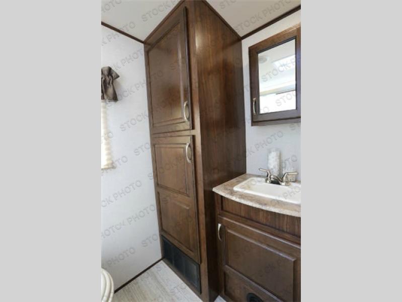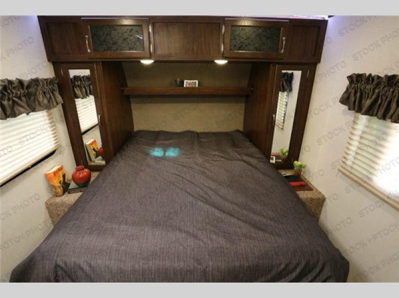 Step inside and find a queen size bed up front with dual wardrobes for clothing storage, plus additional cabinetry above the head of the bed along with a shelf below. You will also appreciate the carpeted stands on either side for your reading book, glasses, or other personal belongings.