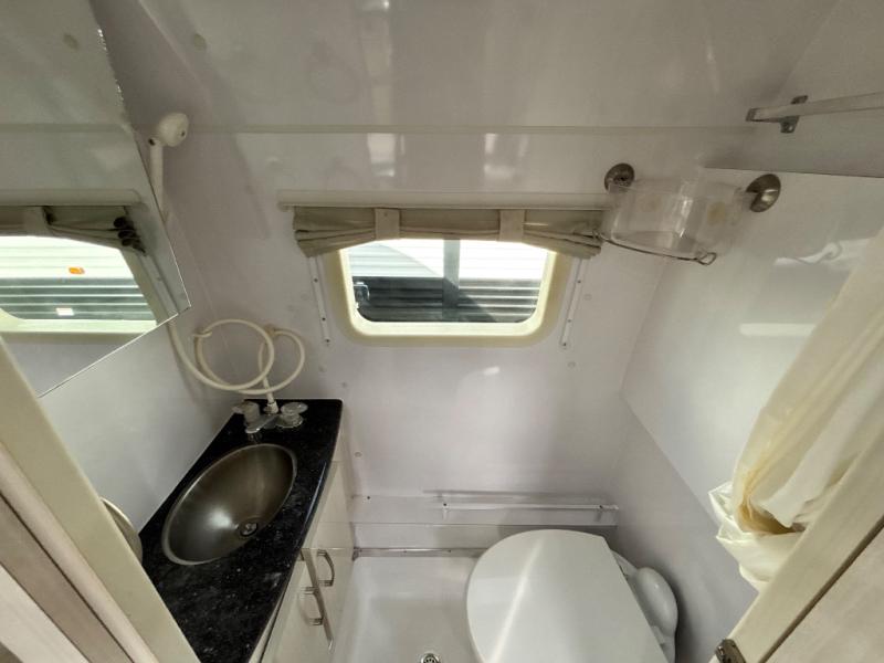 As you enter to your left there is a long kitchen counter for easy food preparation, a single sink, and a two burner range. A refrigerator for your non-perishables with a microwave above are on the opposite side.
