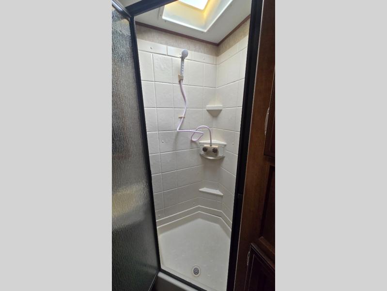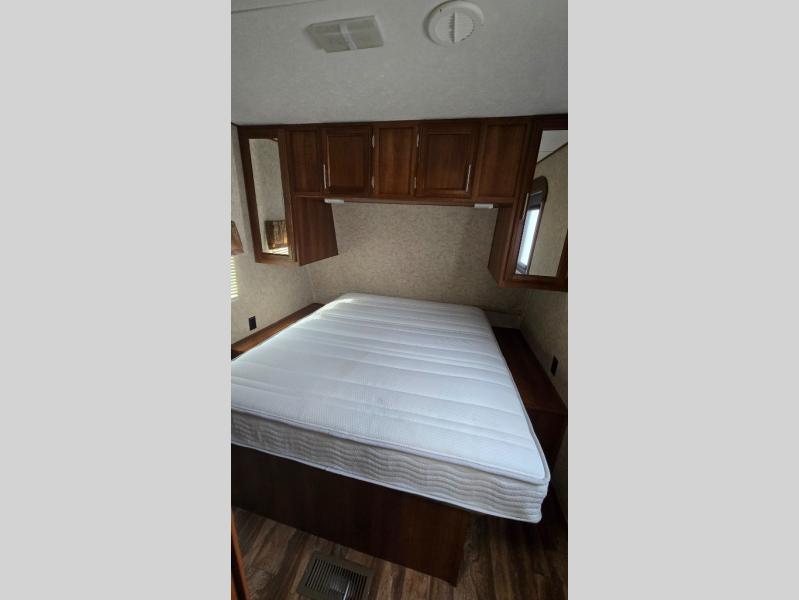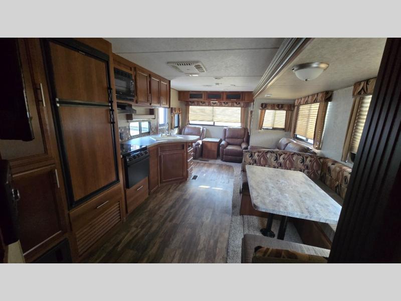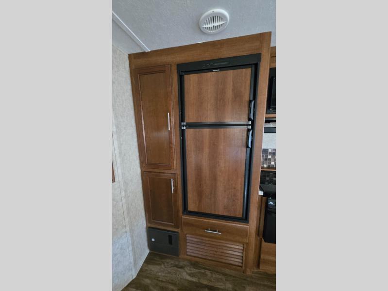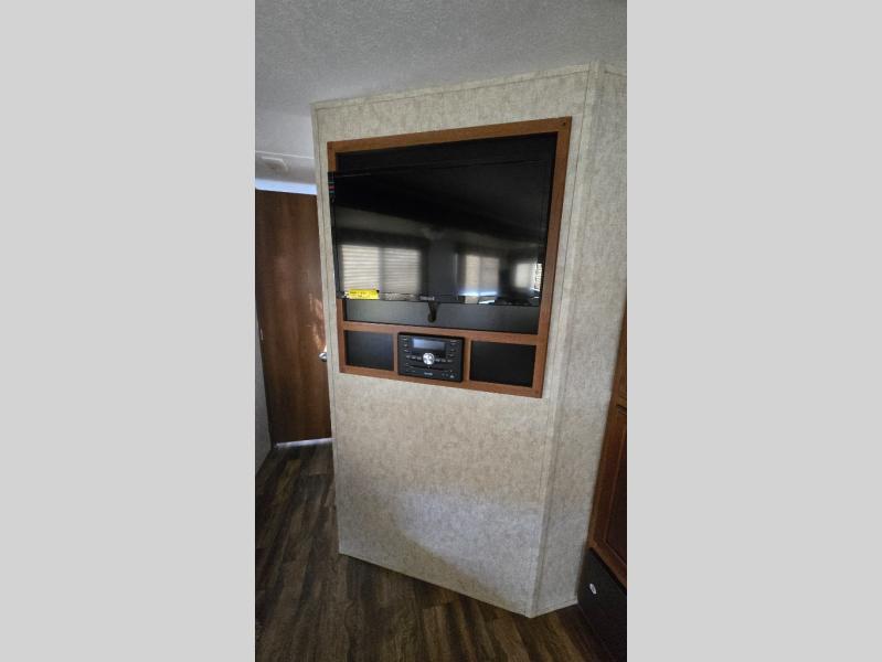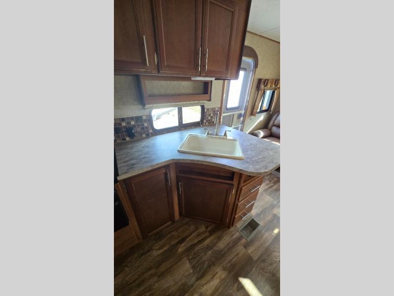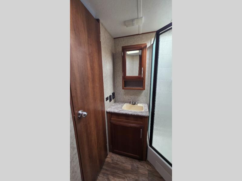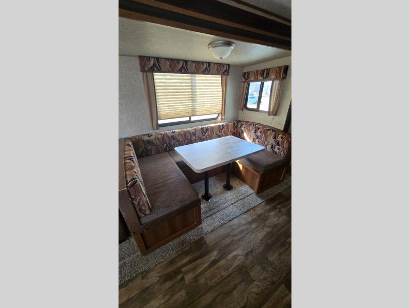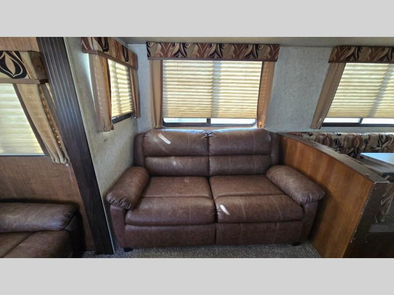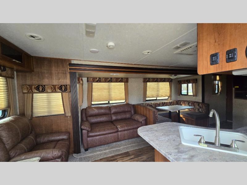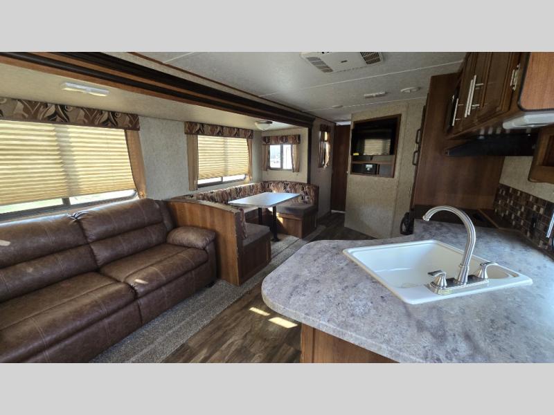 As you enter this travel trailer, you will be in the kitchen and living area. To the left of the entry door there are two chairs with an end table and overhead storage along the rear wall. A single road side slide out includes an 87" u-dinette, and sofa with overhead cabinets. You are sure to enjoy the TV mounted on the outside wall of the bathroom.
