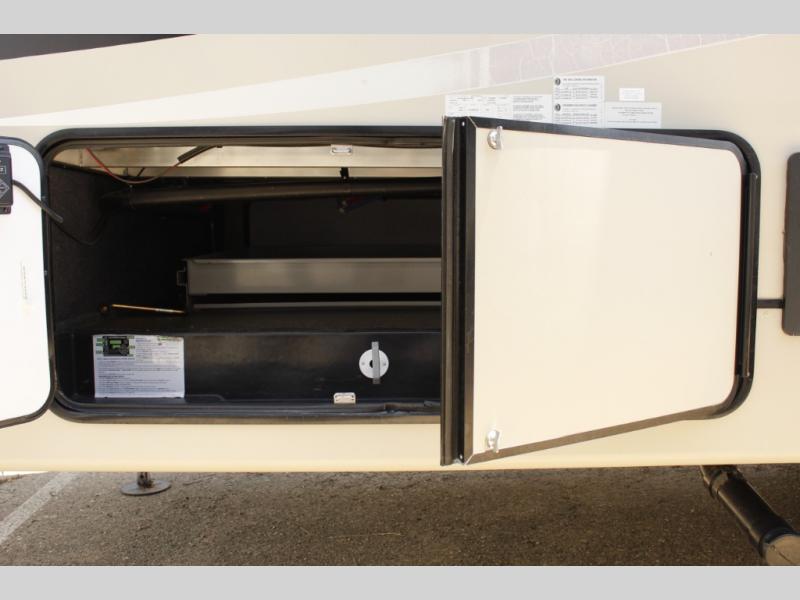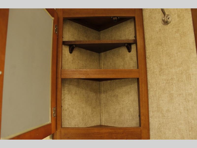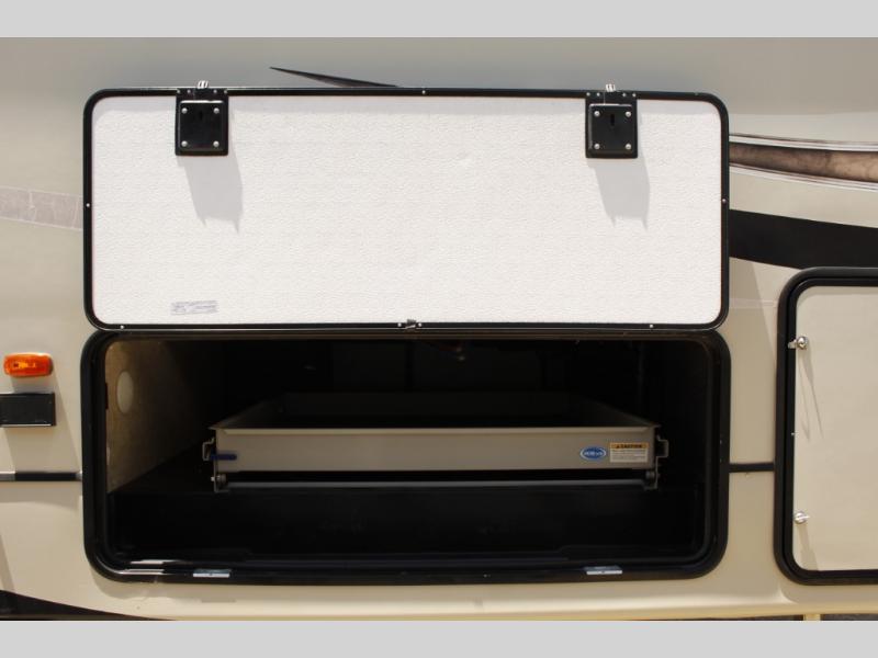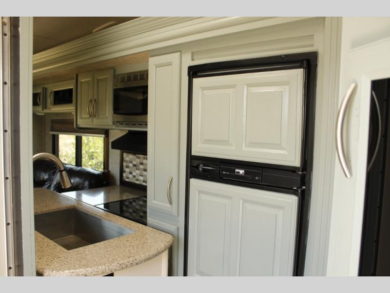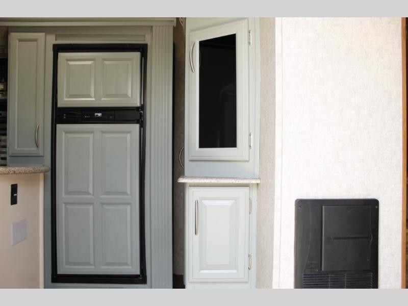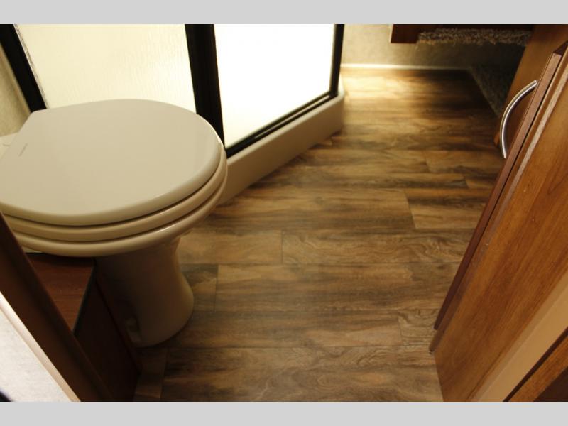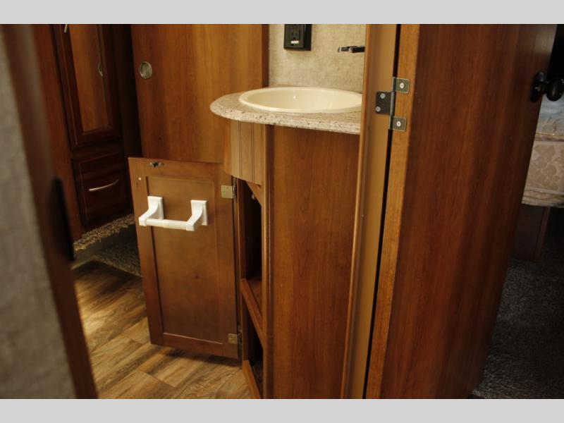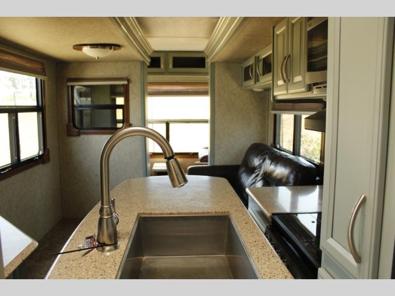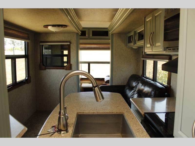 To the left of the entrance you will find a slide out with an entertainment center and a dinette. Along the rear wall there are two comfortable recliners. There is another slide out in the main living and kitchen area which features a hide-a-bed sofa, three burner range, pantry, and refrigerator. Next to the slide you will find an additional pantry. The kitchen island offers extra counter space as well as a double kitchen sink.