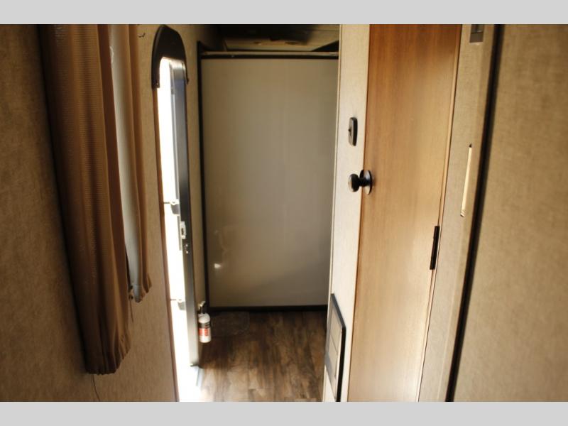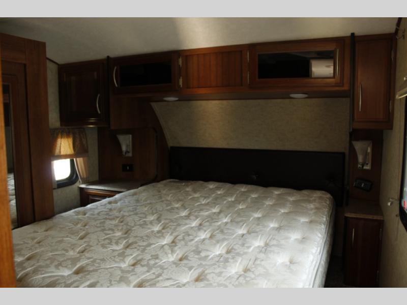 The front bedroom greets you with a queen bed and dual nightstands. The slide out along one side of the room provides additional storage with a linen closet and a wardrobe, and more!