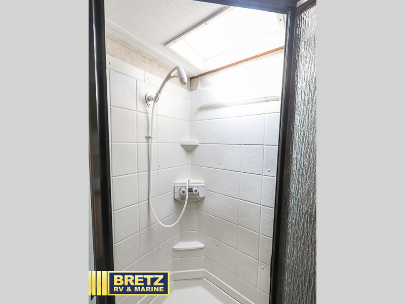 As you enter the fifth wheel, to the left is a slide out with a three burner range, refrigerator, and large entertainment center. Along the rear wall there is a hide-a-bed sofa with end tables. The other slide out has theater seating and a dinette. In the middle of the kitchen you will find a handy kitchen island with a double kitchen sink. Along the interior wall there is a closet and a pantry.