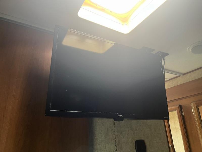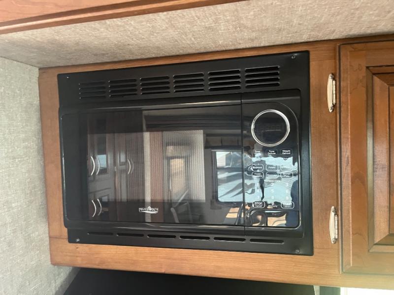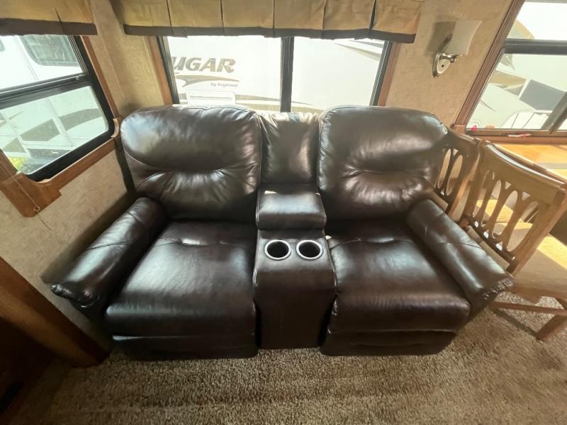 The slide out that features the kitchen appliances also features a entertainment center that can easily be viewed by all of the seating in the room. Along the rear wall there is a hide-a-bed sofa with end tables and storage overhead. Opposite the entertainment center find a second slide out that features theater seating and a booth dinette. There is storage above the theater seats, and the dinette can easily be turned into sleeping space at night when needed.