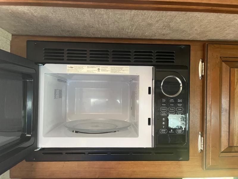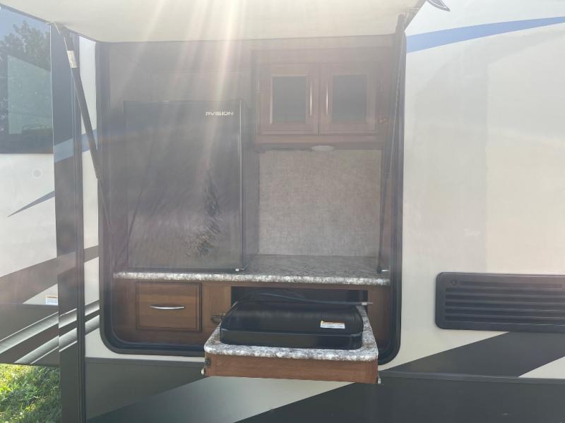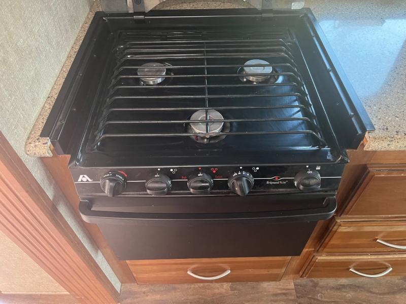 Check out the cooking area before heading inside. Along the curb side within the outer slide you will find a refrigerator, overhead storage, and a two burner cook-top. This will make cooking meals easy when you want to enjoy the great outdoors.