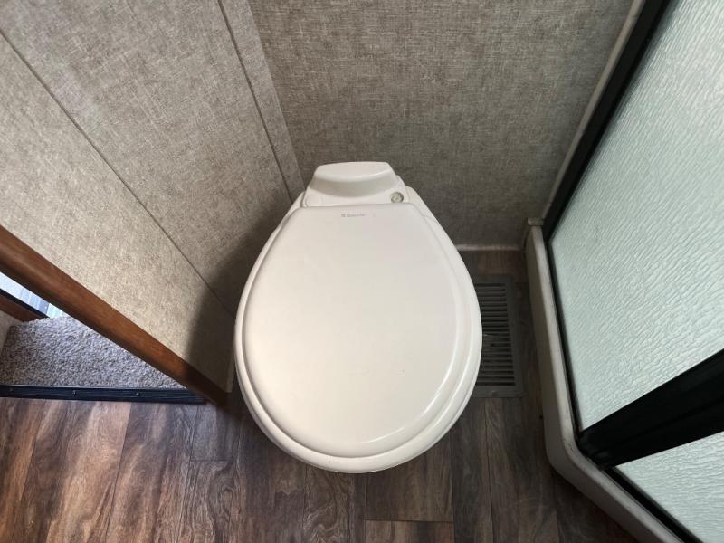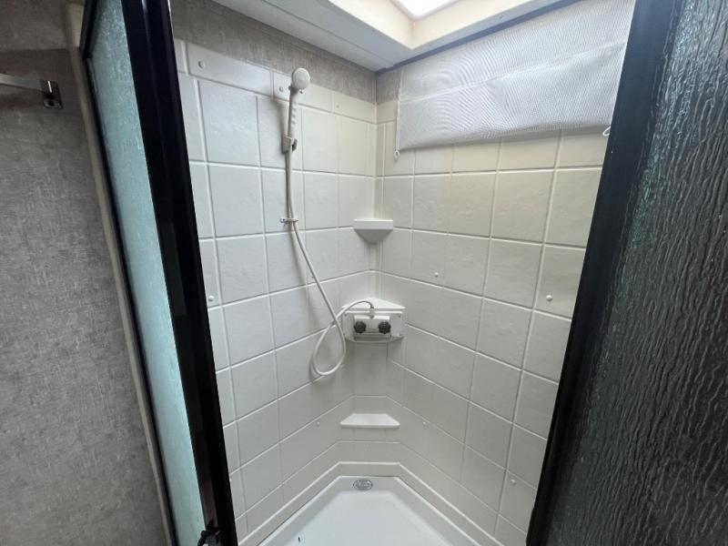 Back at the entry door head to the right, and up a step to the front master bedroom and complete bath. The bath is on your left at the top and offers a spacious place to freshen up. There is a corner shower, toilet, and vanity with sink. A second entry door in the bath leads into the front master where you have easy access to the linen and wardrobe storage slide out.