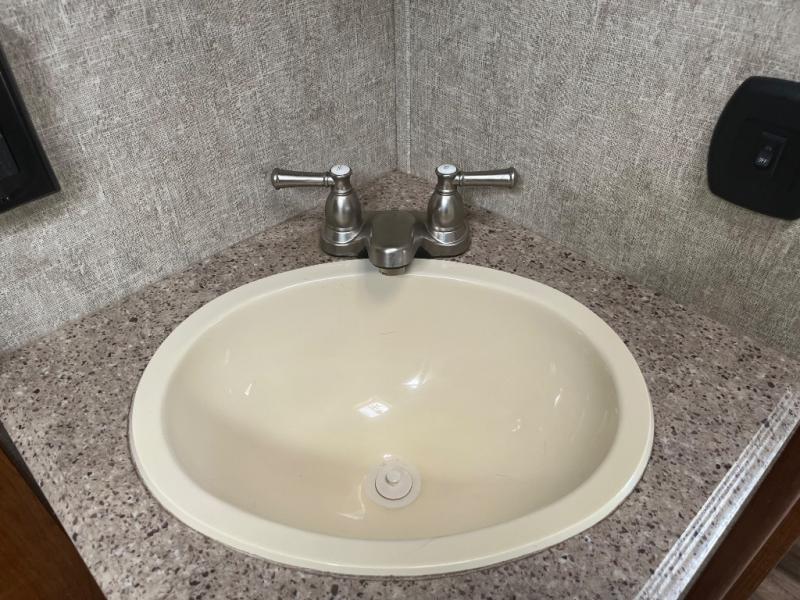 On the inside you will also find cooking your favorite meals easy with the amenities provided. There is a three burner range to the left as you enter, along with an 8 cu. ft. refrigerator, and counter space. You will find the center island handy for food prep and clean-up as it also features a double sink. There are plenty of storage cabinets above and below the counter top, and a nice storage pantry can be found along the interior living room wall straight inside the door. Next to it is a closet for additional storage.