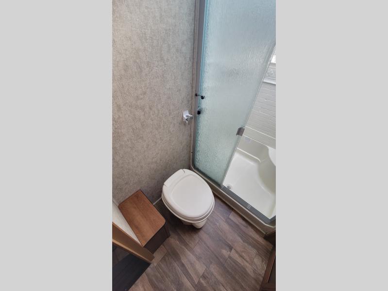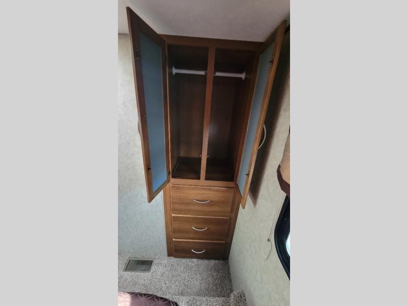 In the front bedroom you will enjoy a walk-around queen bed with nightstands and overhead storage. A closet is near the foot of the bed for additional storage needs.