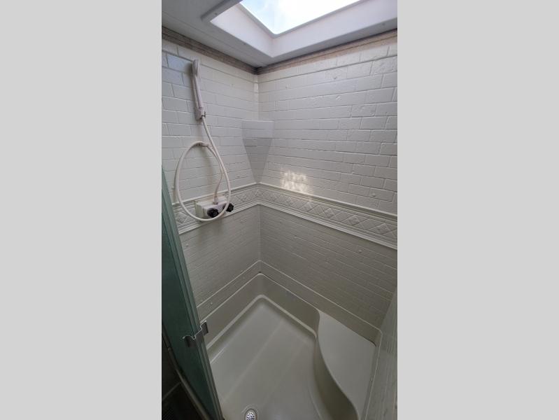 Stepping up the stairs, the bathroom is on your left. Inside the bathroom there is a toilet, a 40" shower, linen storage, and a sink with medicine cabinet above.