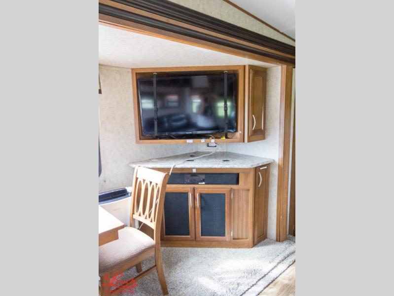 To the left of the entrance there is a slide with a dinette and entertainment center, TV, and overhead cabinets.