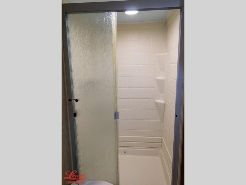 In the rear kitchen area you will find, along the rear wall of the fifth wheel a pantry, refrigerator, and three burner range. The countertop continues to the road side wall providing overhead storage for your pots and pans. A L-shaped counter provides additional work space and a double kitchen sink for easy cleanup.