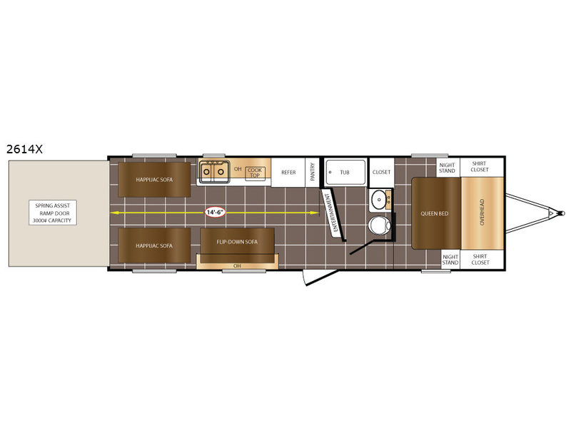 Located in the rear you will find a spring assist ramp door for easy loading and unloading. The cargo area has two Happijac sofas for additional seating space during the day, and sleeping space at night. You can even choose the optional Party patio kit for the ramp door for an outside raised patio entertainment area.