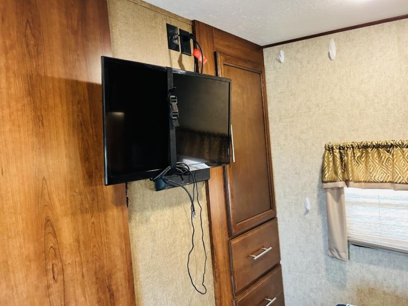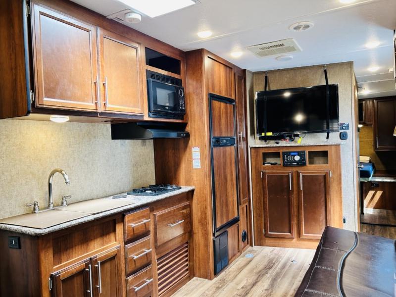 In the private front bedroom you will find a queen bed with nightstands and shirt closets on each side of the bed. Above the bed there are overhead cabinets which help to keep your things neat and tidy. In the corner of the room you will find more storage in the closet, plus there is much more inside and outside this toy hauler to enjoy!