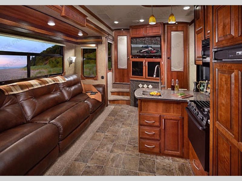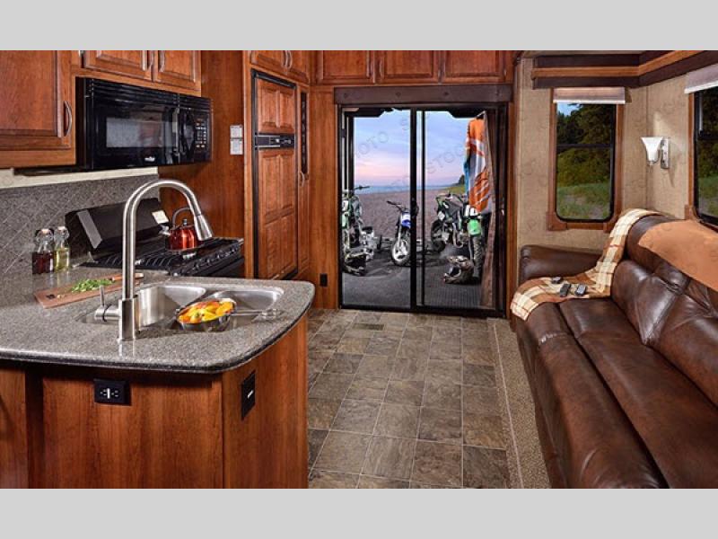 You can enter the main living area through a sliding door from the garage or from the main entrance along the curb side. The kitchen offers a refrigerator, three burner range, l-shaped counter with a large sink, and extra counter space. The opposite side of the fifth wheel has a slide with a three-piece reclining sectional and stowable table. Along the interior wall, just before you step up the stairs, there is an entertainment center.