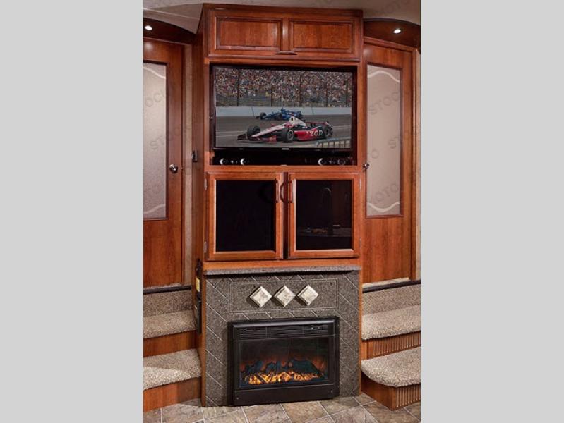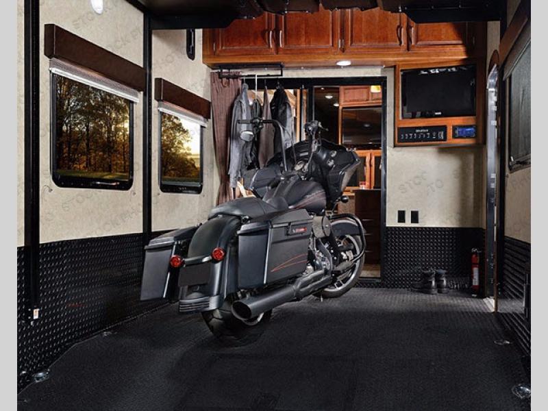 In the rear garage you will find a ramp door for easy loading and unloading, as well as a Happijac electric lift system with adult sized bed including dual folding sofas below. In the corner, to the right of the side man door there is an entertainment center for your inside enjoyment.