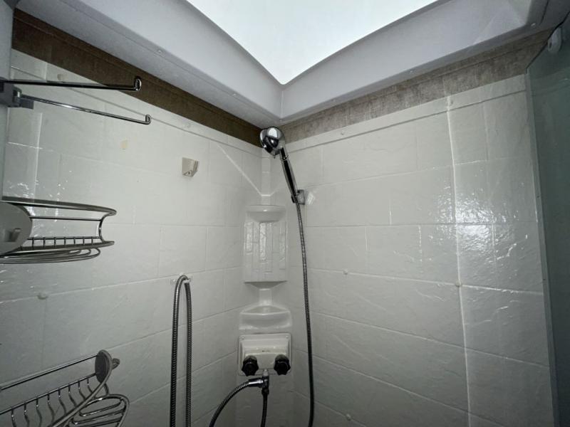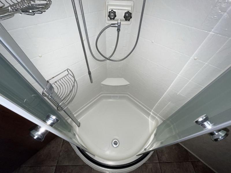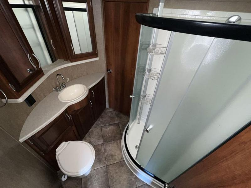 Speaking of the bathroom you can access it up two steps just inside the main side entry door along the curb side, or head around the entertainment center and take the steps up to the master suite where you can also enter the bath for added convenience. Inside you will find a radius shower, toilet, and nice vanity with sink plus two medicine cabinets.
