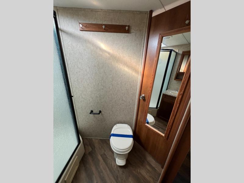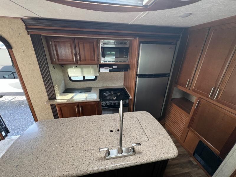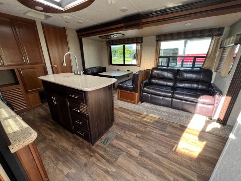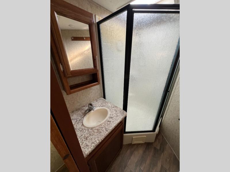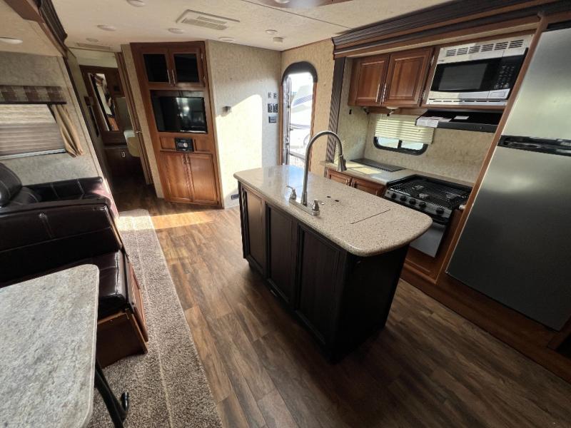 As you enter the travel trailer, to your left there is a slide with a refrigerator, extra counter space, and a three burner range. Next to the slide there is a large pantry for your dry goods. The kitchen island provides additional counter space and has a double sink. The road side slide features a hide-a-bed sofa and a dinette. Across from the sofa, along the outer bath wall there is a nice entertainment center which is sure to be enjoyed by all.