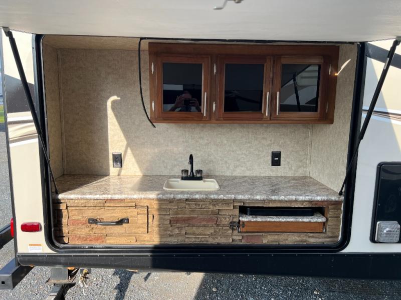 Outside you will find an exterior kitchen which offers a sink, refrigerator, and two burner cooktop, plus more!