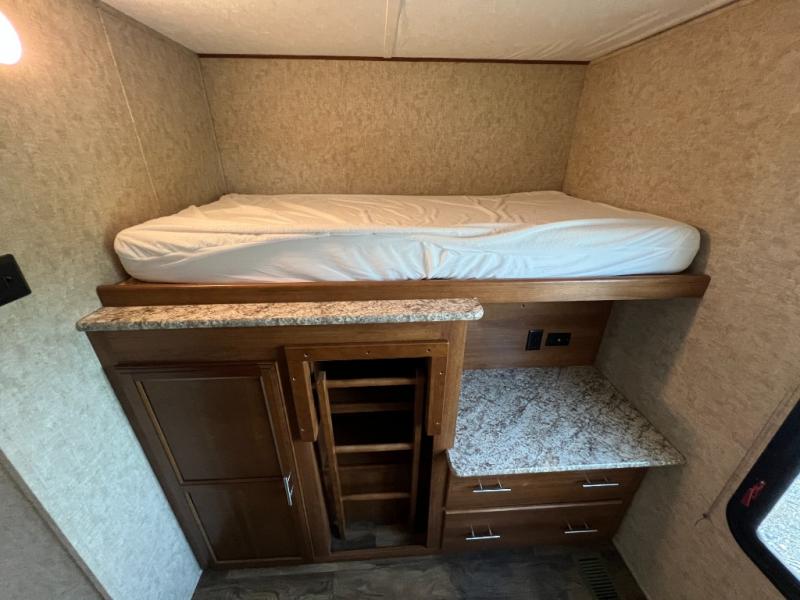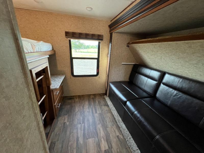 The rear bunkhouse is a great place for your kids to hang out. There is a slide with a sleep and play and a bunk above. On the opposite side you will find an additional upper bunk with storage, a counter, and ladder below.