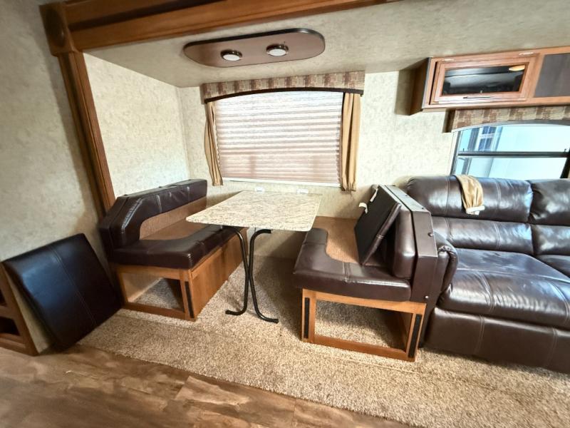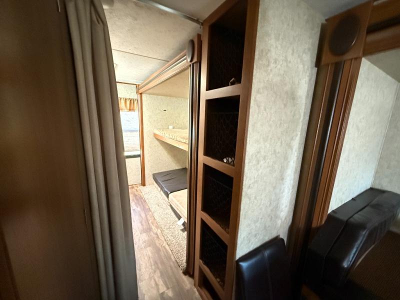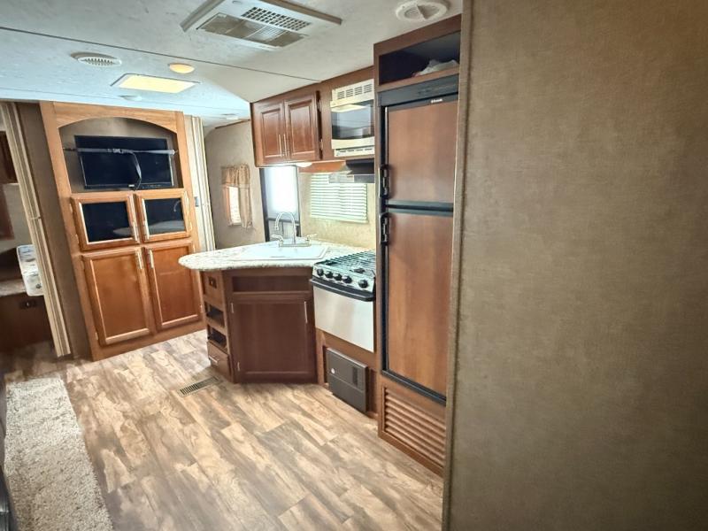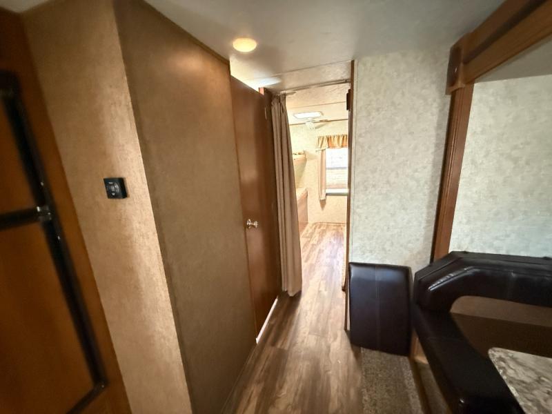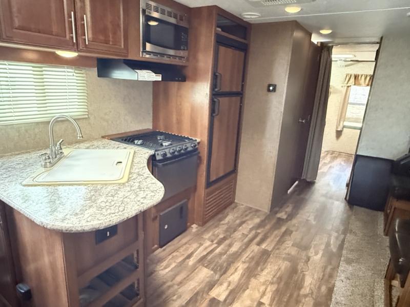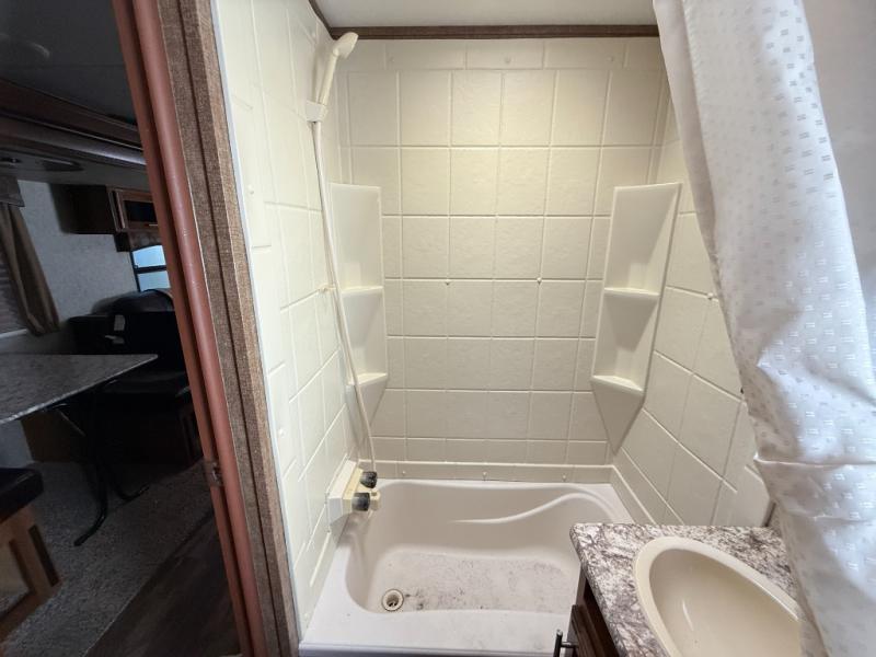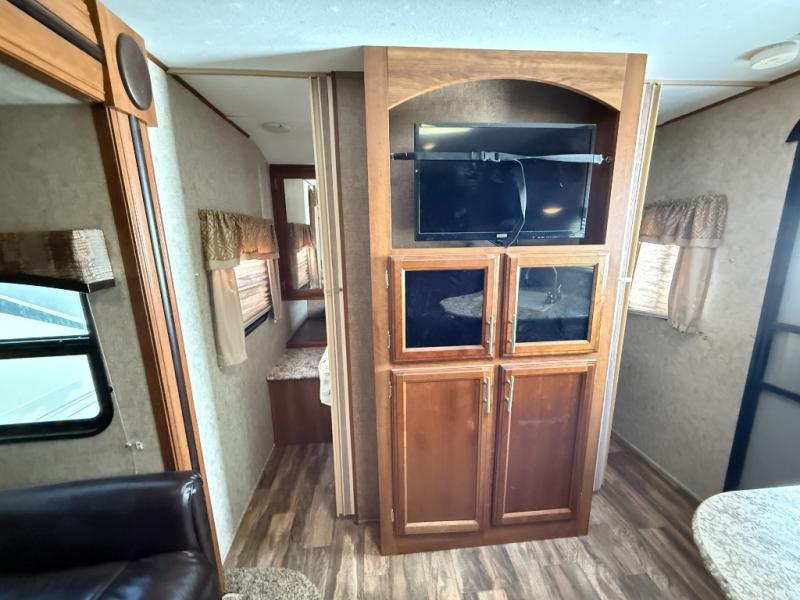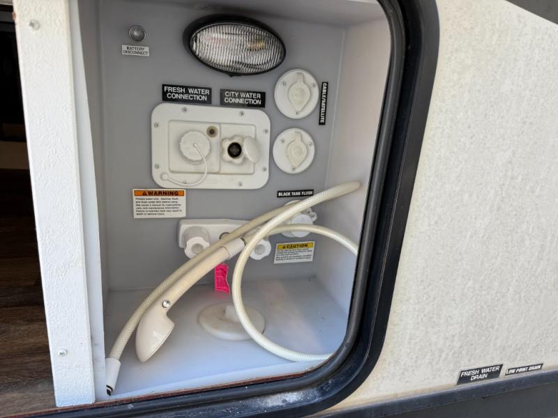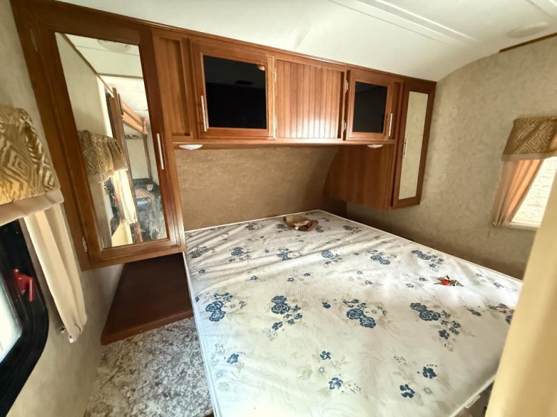 The kitchen and living area have a refrigerator, three burner range, and large sink along the curb side of the trailer. The opposite side has a slide out hide-a-bed sofa, and dinette. Adjacent to the slide there is a nice size pantry for your dry goods. Along the front of the living area, but before you enter into the bedroom there is a large entertainment center.