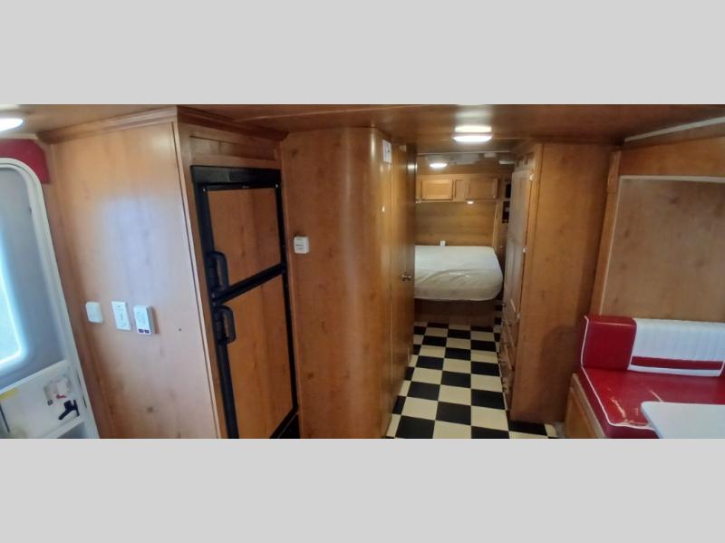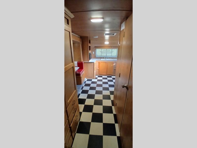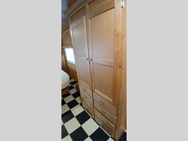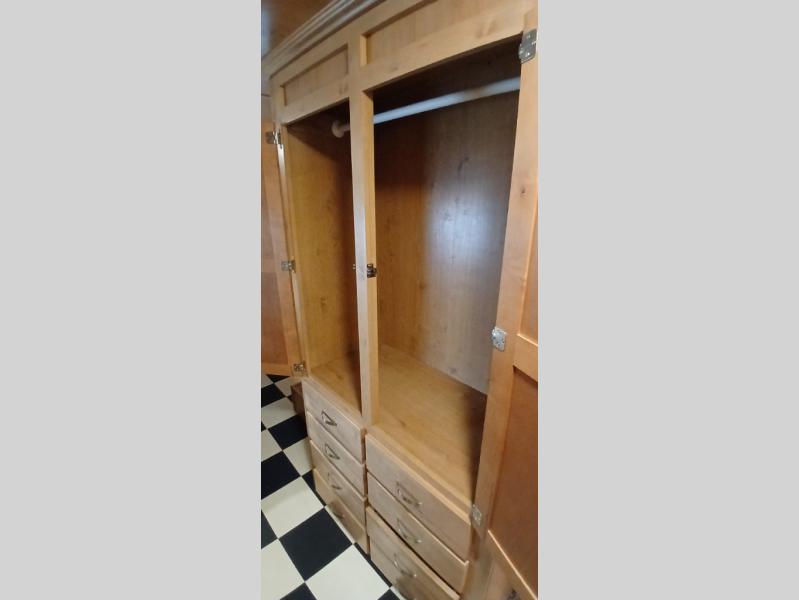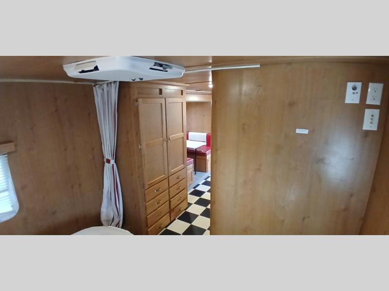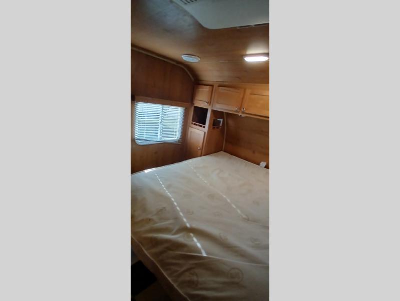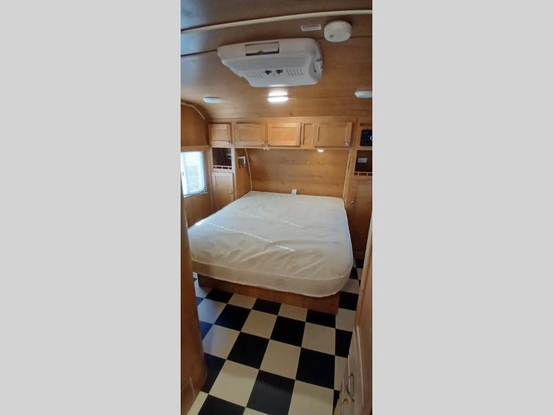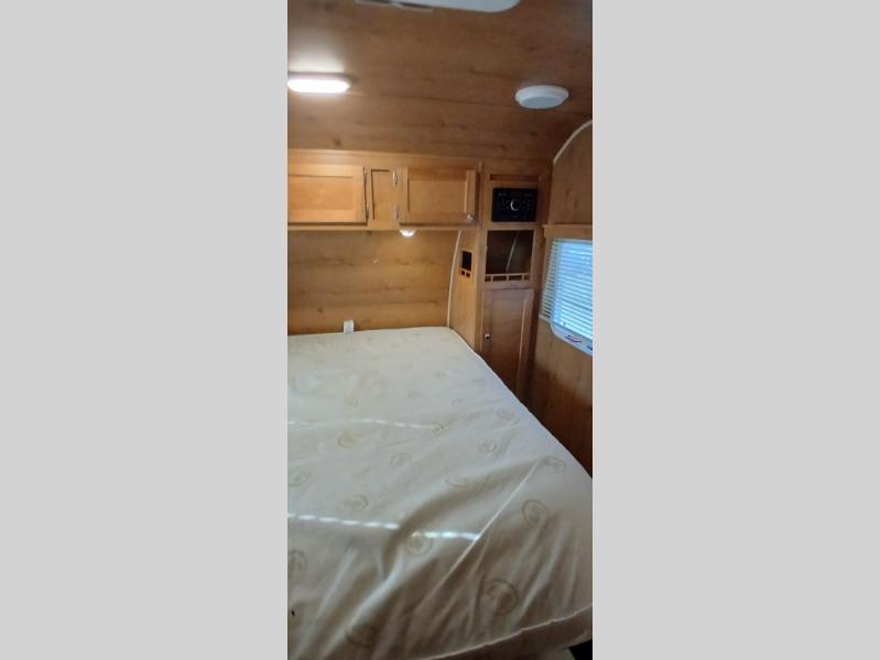 The rear bedroom features a queen size bed with cabinets and a shelf on each side, plus upper cabinets the entire width of the space, and so much more!