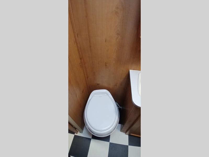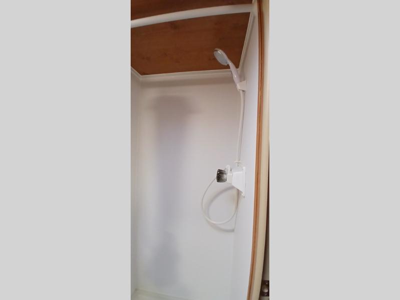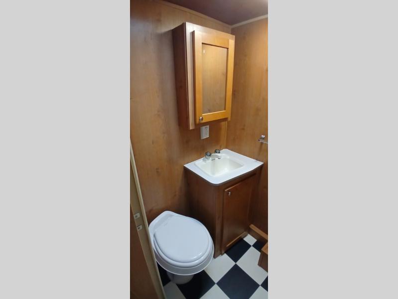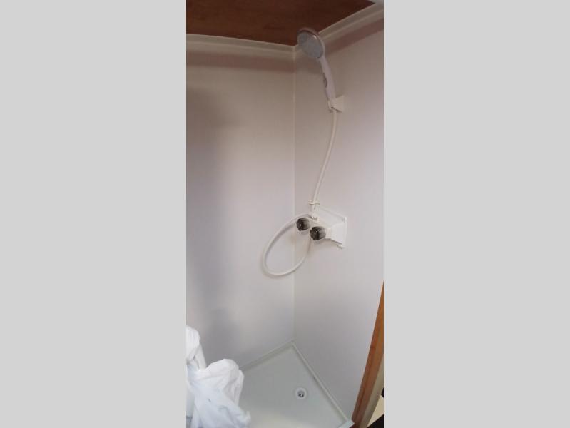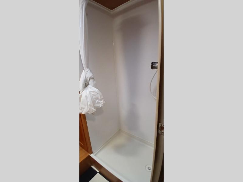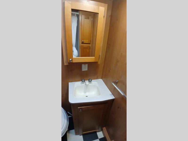 In the middle along the curb side a complete bath makes camping enjoyable where everyone can get cleaned up thanks to a shower, toilet, vanity with sink, and linen cabinet. Opposite the bathroom you will find storage along the road side that features upper cabinets and lower drawers for all of your clothing.