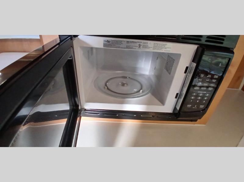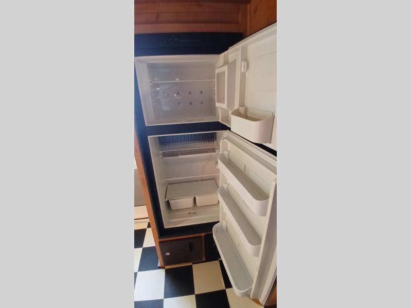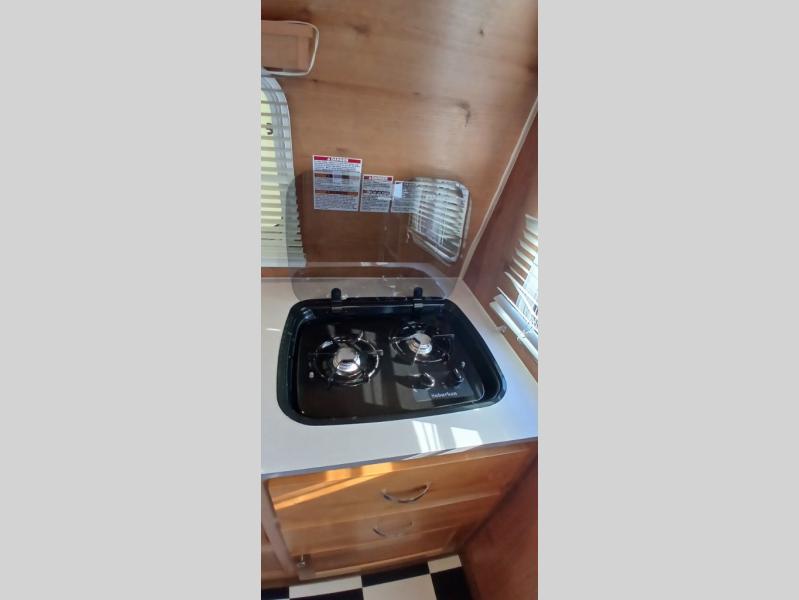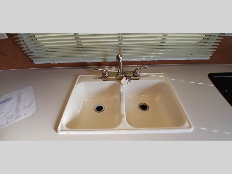 Just inside the door on your left find a refrigerator to keep your cold stuff cold, and on the right side along the front of the unit there is a bit of counter space for food prep with a microwave oven, a double sink for cleaning up, and a two burner cook-top. You will also find ample storage for your daily dishes and kitchen necessities here as well.