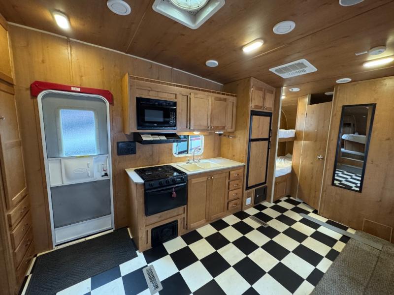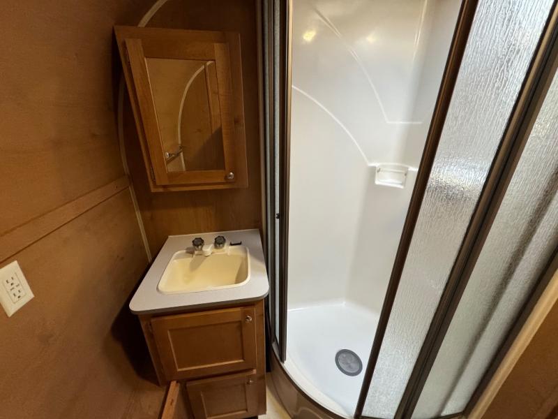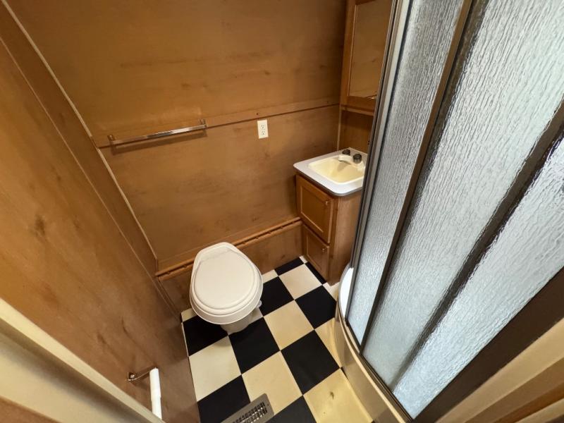 Located in the rear you will find a bathroom with a sink, angled shower, and toilet. The opposite rear corner features a set of bunk beds.