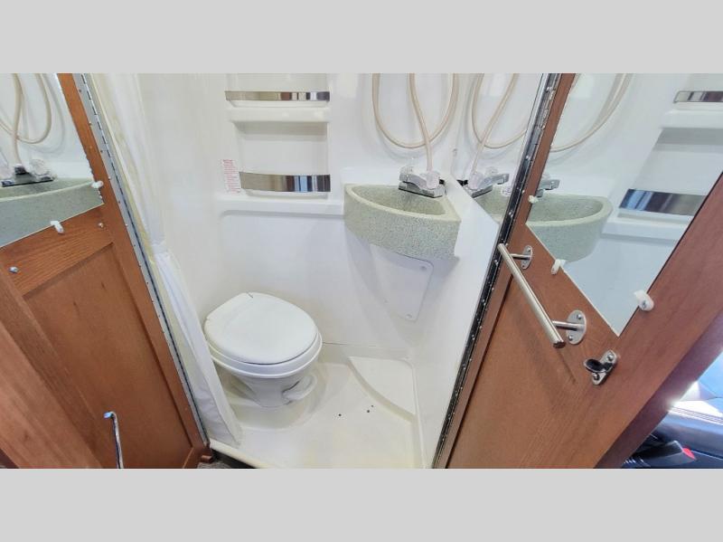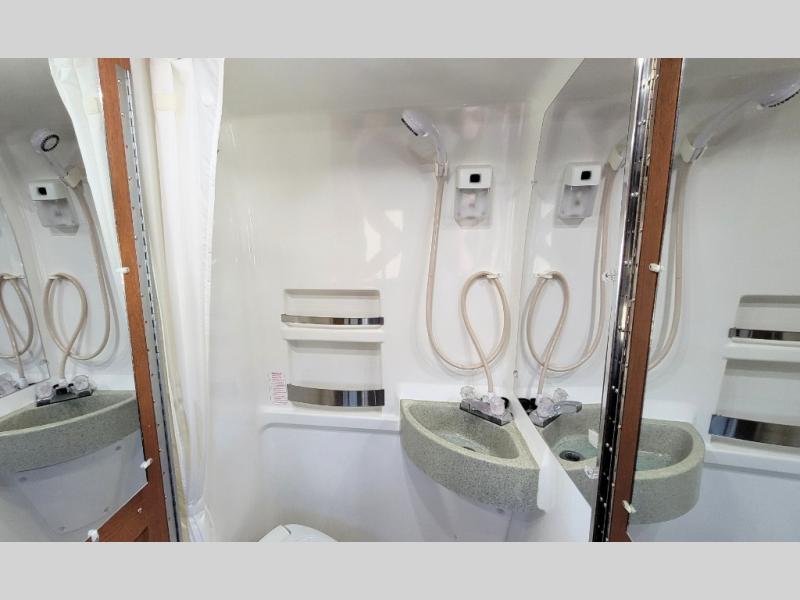 The bathroom is located behind the driver's seat. Here there is a shower, toilet, and sink.