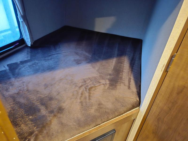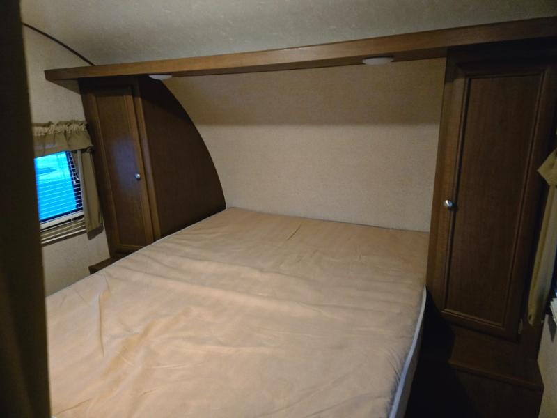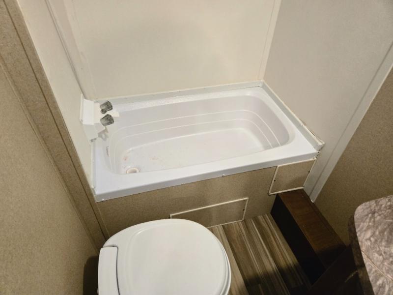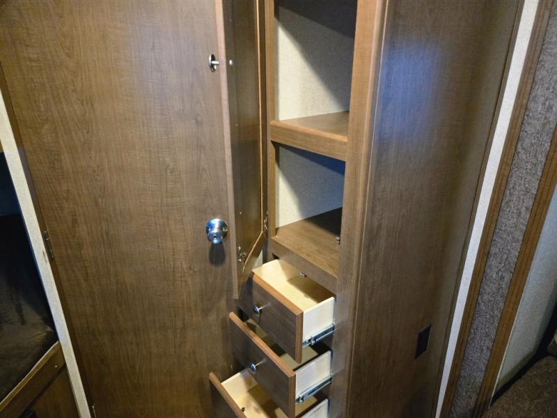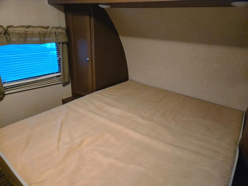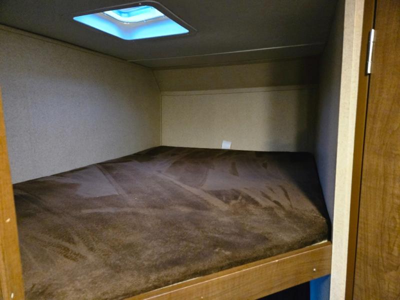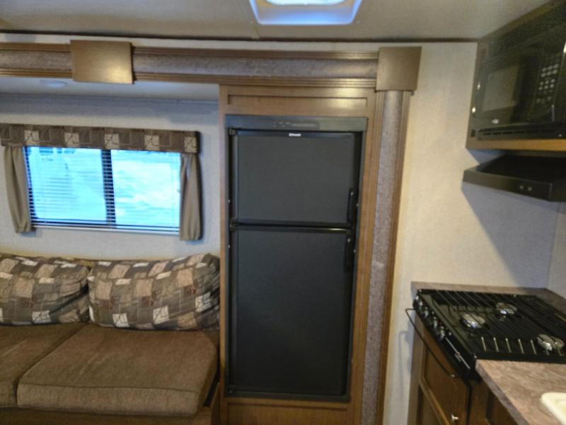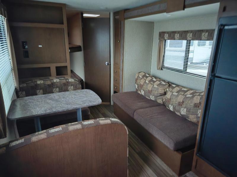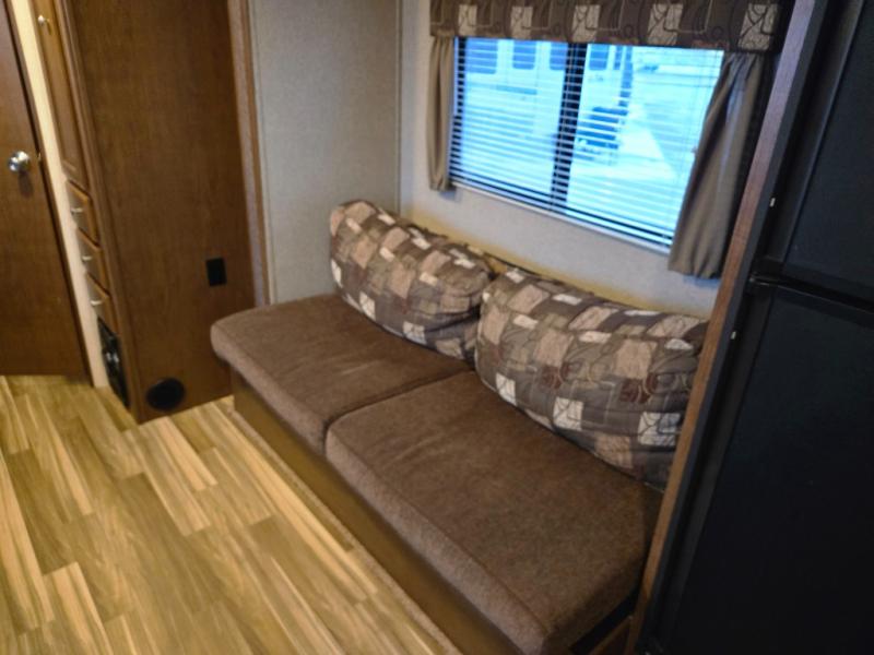 As you step inside you will see how convenient your camping can be the next time you head out for a weekend filled with fun. There is a booth dinette to your immediate left for dining along with an entertainment center along the back side for easy viewing throughout the living space.