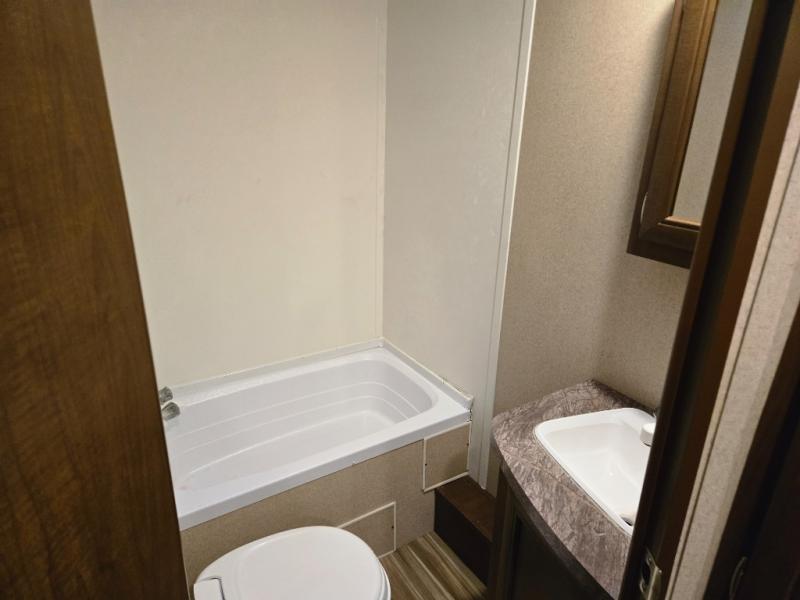 In the rear of the unit there is a corner bath featuring a tub/shower, toilet, and sink.