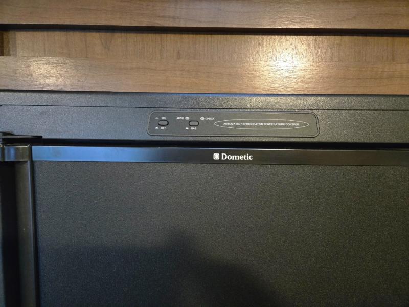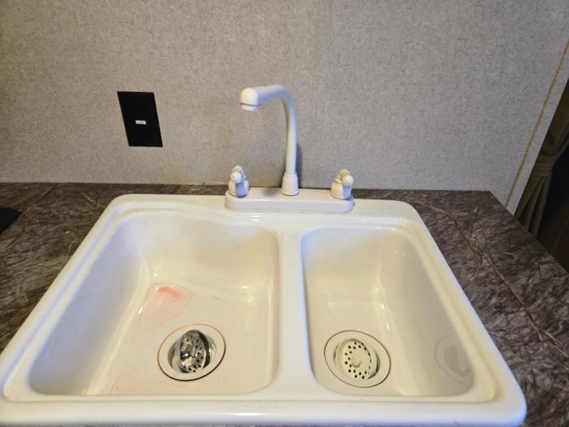 Straight in through the door you can see a counter area with a double kitchen sink and a three burner range along with a microwave oven along the interior wall. There is a pantry and refrigerator within the large slide opposite the door that also includes a 64" sofa.