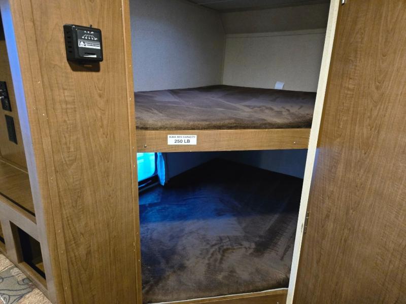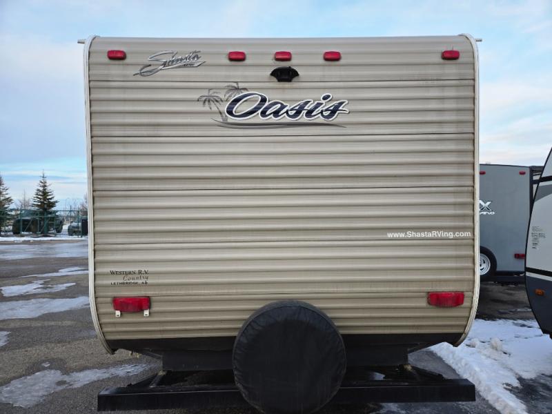 This Shasta Oasis travel trailer 25RS features a rear bath, a set of rear bunks, and a large single slide for added interior space.