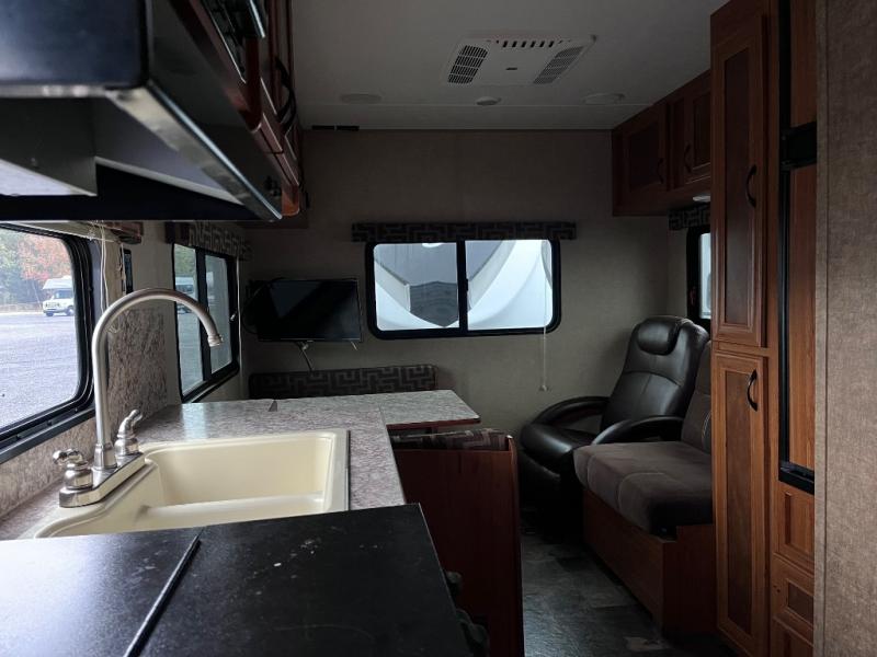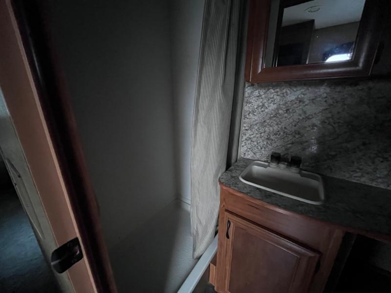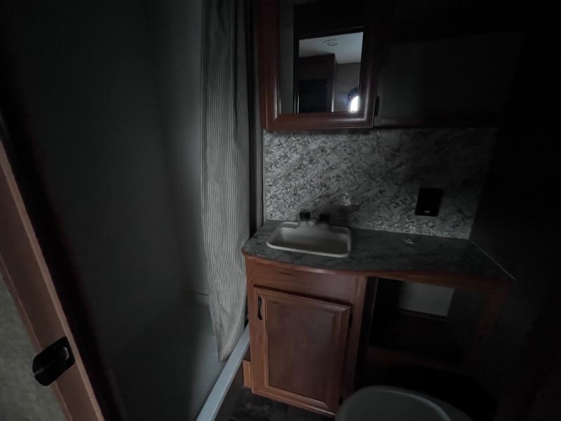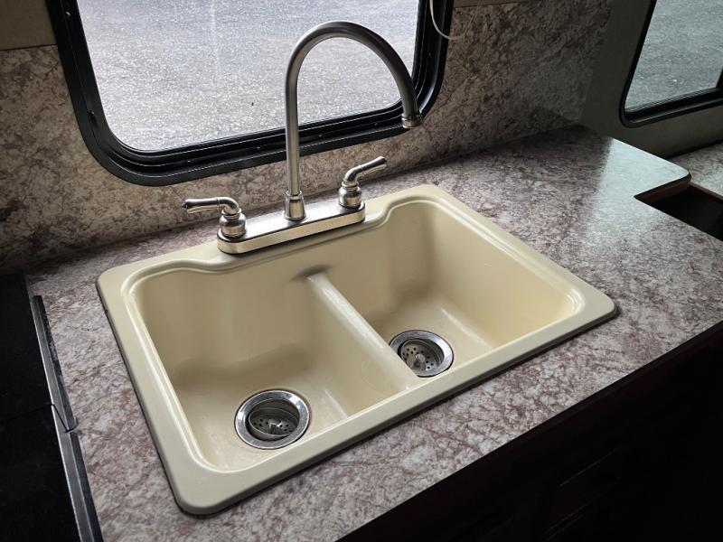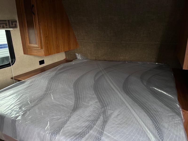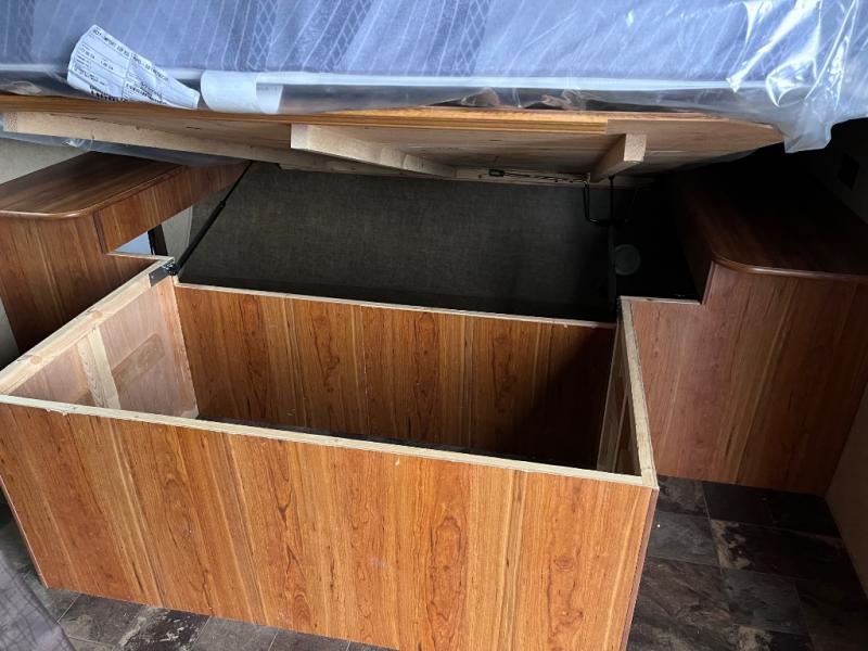 There is a booth dinette with overhead cabinets on the left in the rear, and a jack-knife sofa with overhead storage on the right. The perfect place to sit and enjoy a meal and conversation. You will also enjoy the extra large window at the dinette to take in the scenic view of your choice while dining.