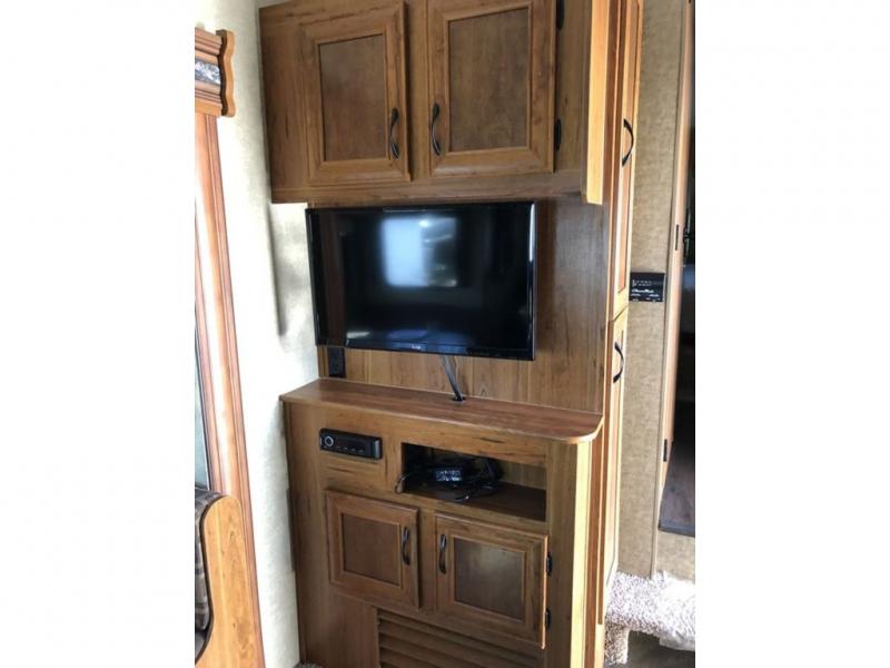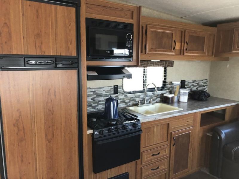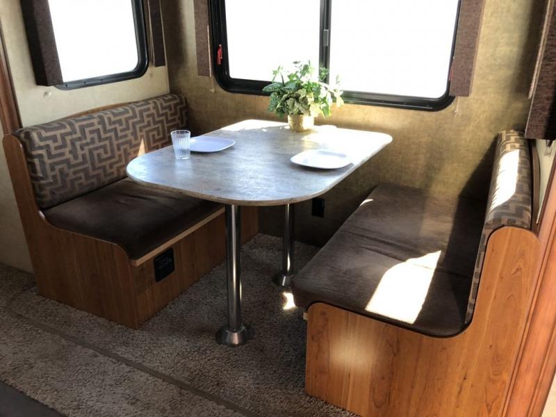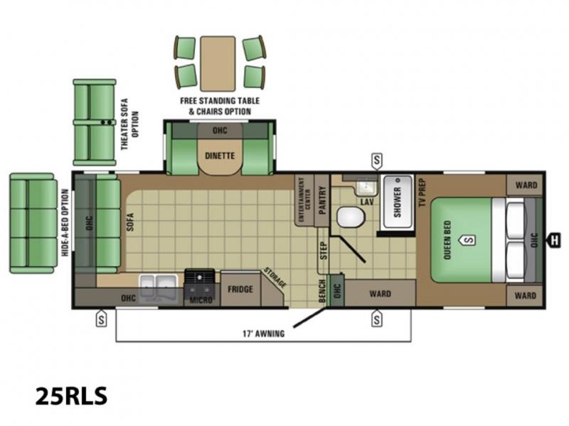 Step inside model 25RLS and find an open layout in the main living and kitchen area which includes a single slide out booth dinette. You can choose a free standing dinette with four chairs instead if you like. There is a handy bench seat just inside the door, and straight ahead you will find an entertainment center/pantry along the interior wall.
