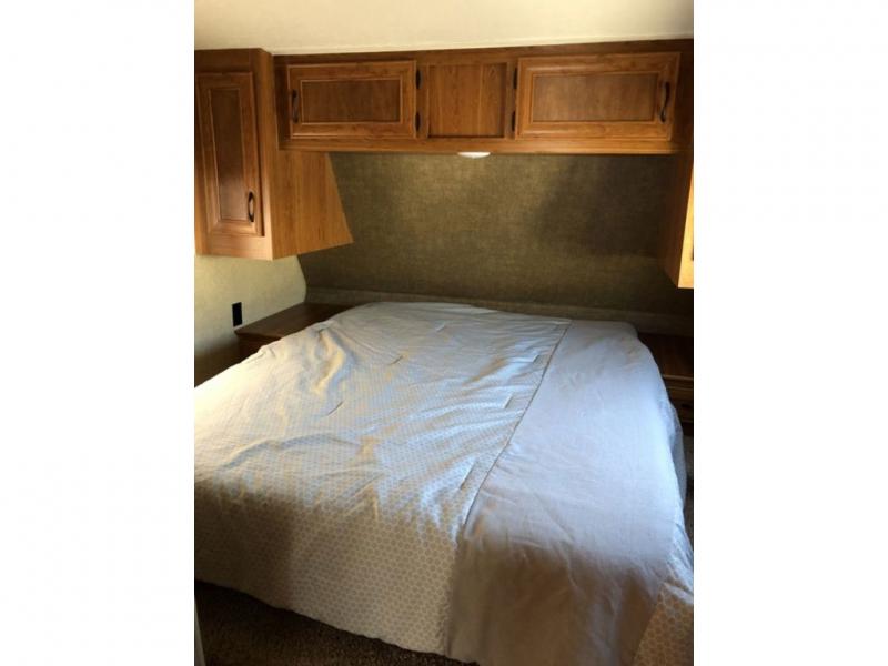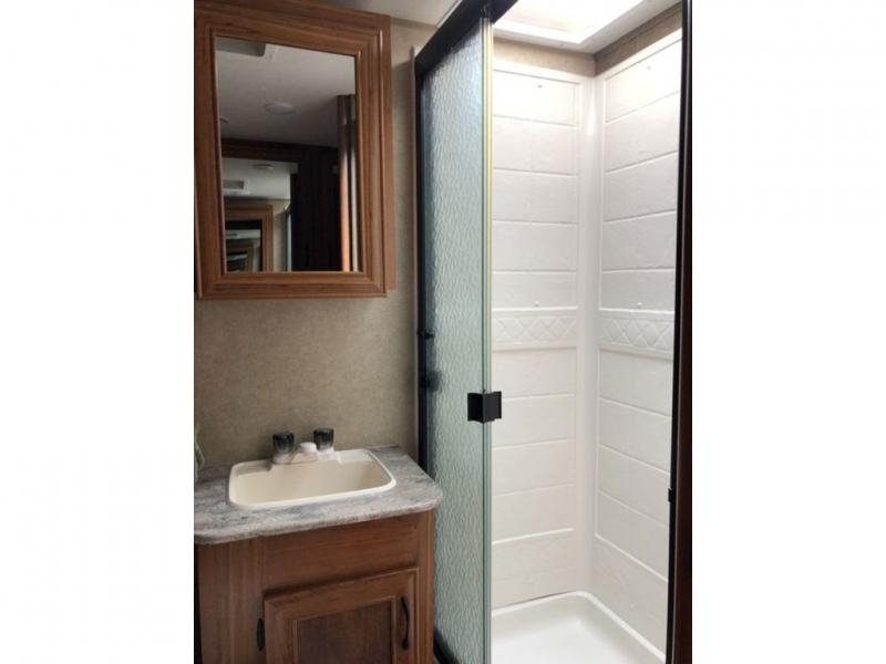 Take a step up in front to the right of the bench seat just inside the door. There is a complete bath including a shower, toilet, and vanity with sink, plus medicine cabinet. You will find a large wardrobe opposite along the curb side wall. This area opens up into the front bedroom space featuring a queen size bed with dual bedside wardrobes, and overhead storage as well. You will like that it is all prepped for a TV if you choose to add, plus so much more!
