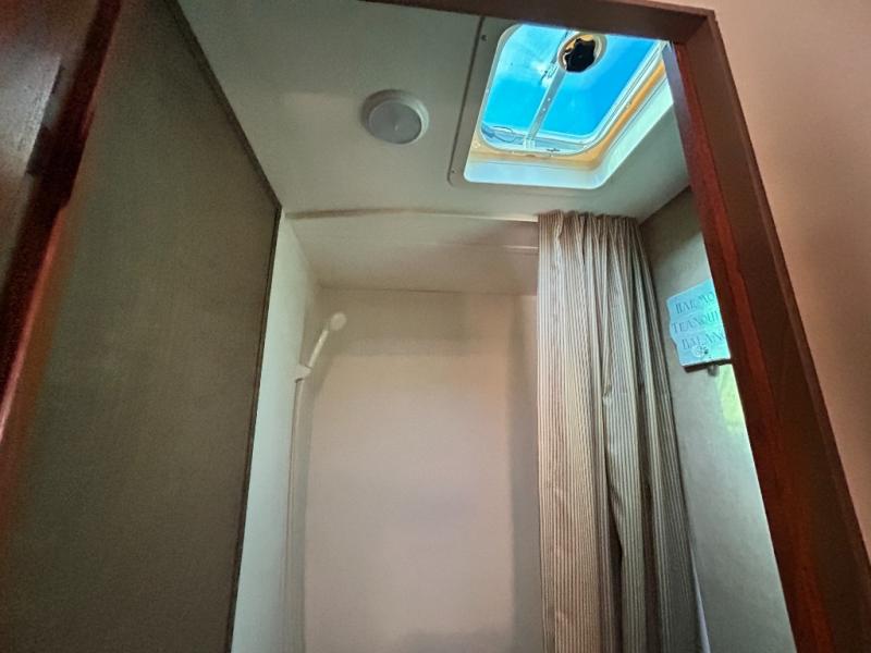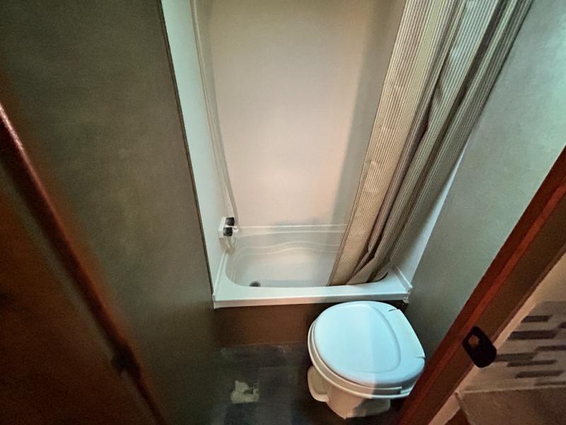 In the rear left corner you will find sleeping for four with a double bed set of bunks. In the opposite corner there is a private toilet and tub/shower area, and a separate sink just outside the bathroom door. There is also a medicine cabinet above the sink.