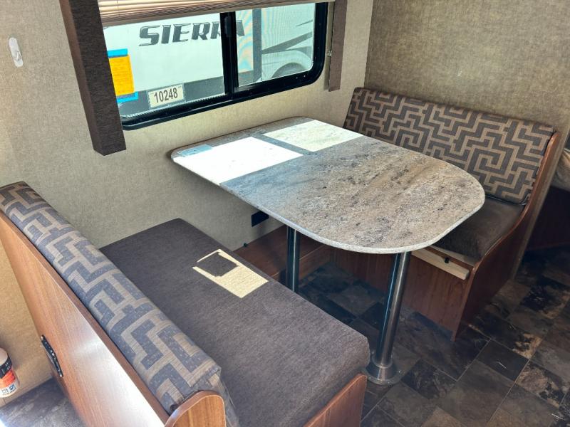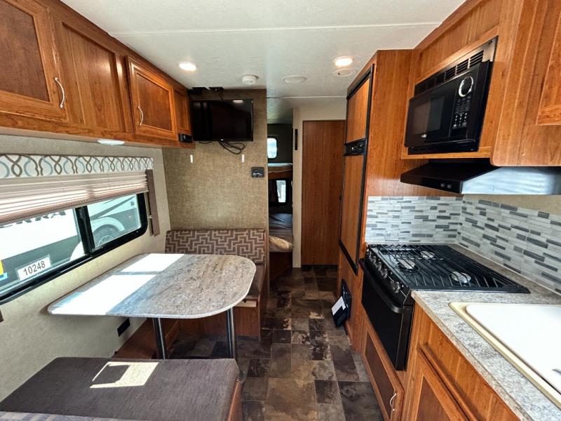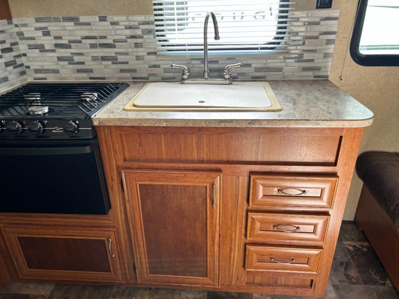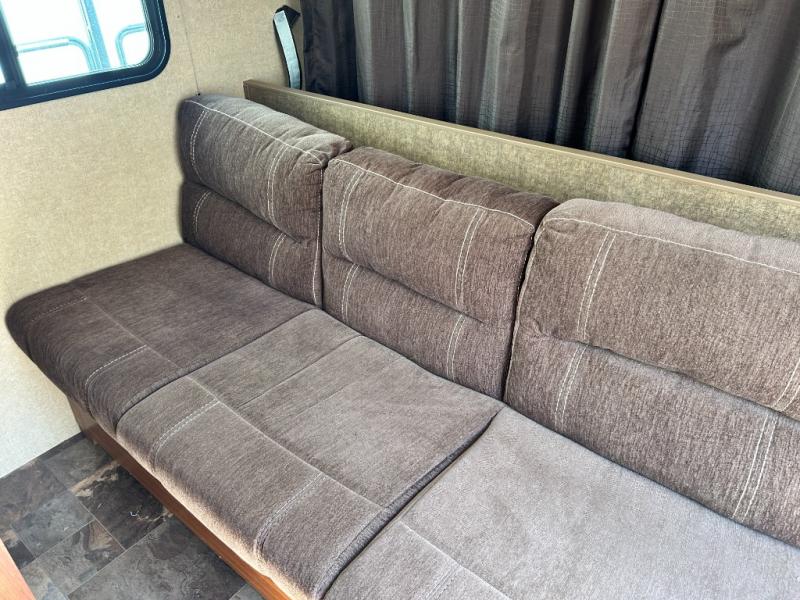A sofa separates the living area from the bedroom. Nearby you will find a booth dinette with overhead storage and all the kitchen appliances needed to create meals and snacks on the go. There is a refrigerator, a three burner range with microwave oven, and a double kitchen sink with overhead cabinets for storage as well.
