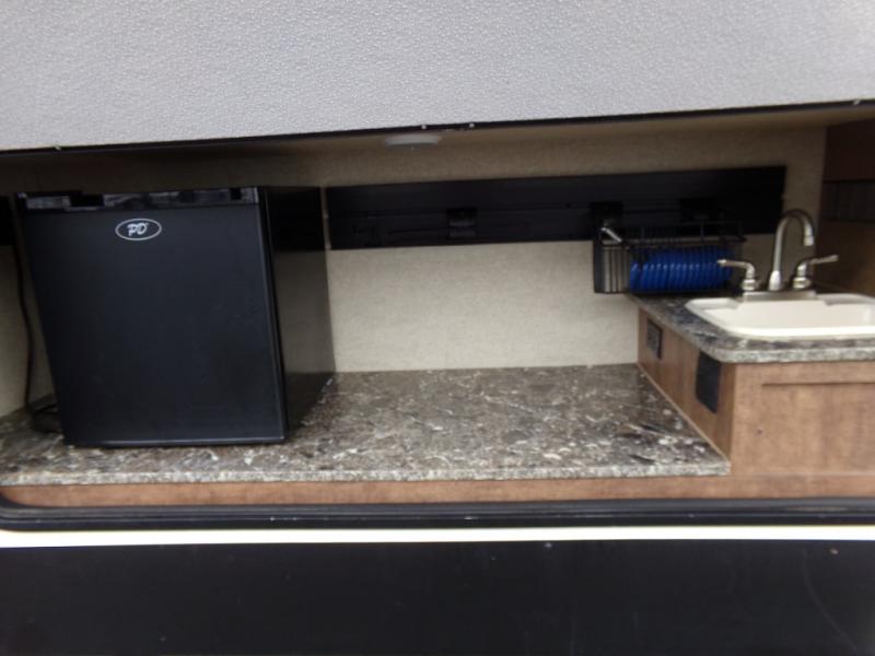 Outside there is an awning, plus exterior storage. Also outdoors, store drinks or a few snacks at the outside refrigerator, and clean up at the sink, plus more!