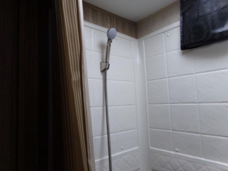 In the right rear corner of the trailer is the bathroom with a sink, with a medicine cabinet, a toilet, and a shower.