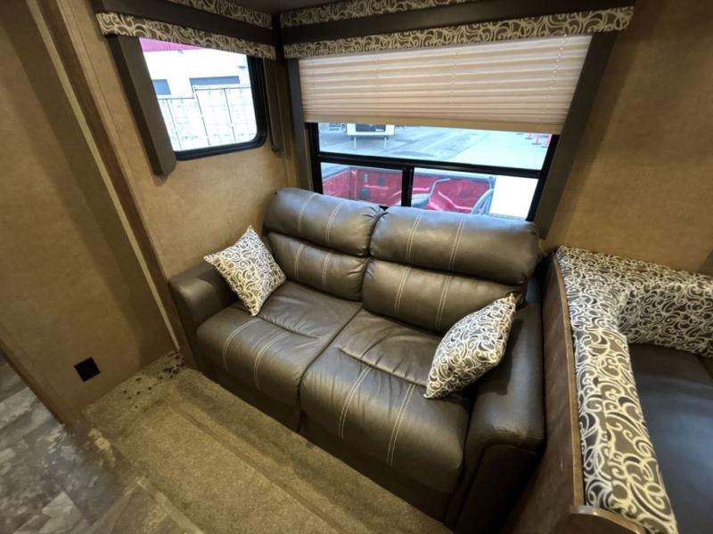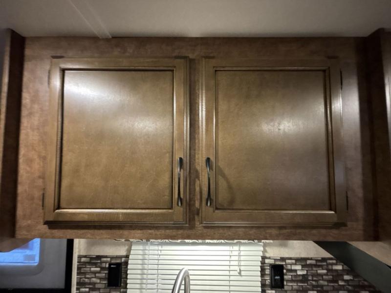 In the combined living/kitchen area you will love the extra space that the slide out offers. Within the slide out there is a u-dinette and a sofa with an overhead cabinet. You can choose a few different options in place of the sofa such as theater seating, a hide-a-bed, or a sleeper sofa. Adjacent to the slide out there is a large pantry.