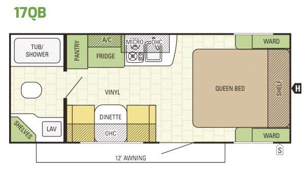 For the couple who just wants to get away and camp in comfort, then choose the Starcraft Launch 17QB travel trailer. This model features a large rear bathroom, and a front bedroom.