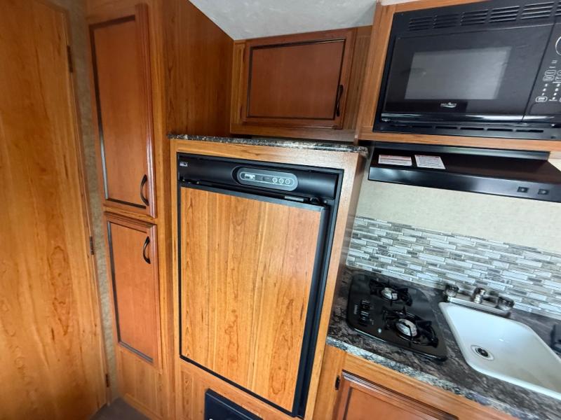 To the left of the entry door you will find a dinette with an overhead cabinet. Here you can enjoy your meals, and at night you can use this area for a smaller bed. Along the opposite side of the trailer is the kitchen area. Here you will find a sink, two burner range, microwave, overhead cabinet for dishes, a refrigerator, and a pantry.