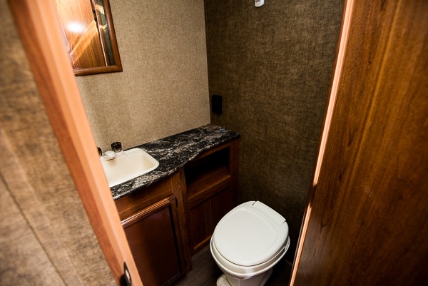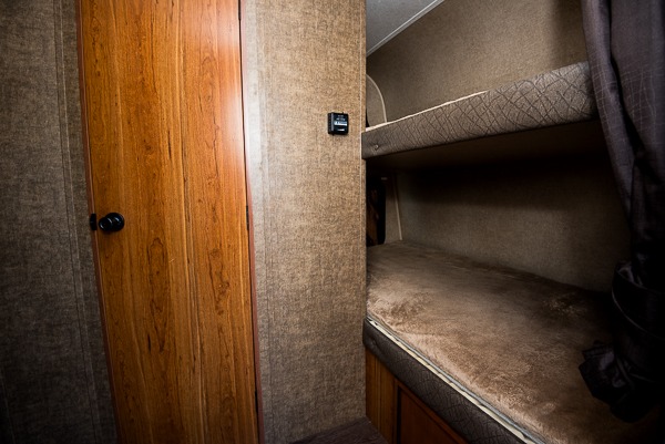 Step inside and see the bunk beds up front. Almost straight in from the door find the bathroom which features a tub/shower, toilet, and vanity with sink.