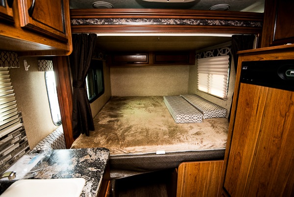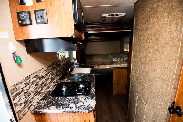 To the left of the door you can do some light cooking on the two burner cook-top with microwave oven above. There is also a single sink, plus overhead cabinets too. The refrigerator is located opposite the sink along the road side wall.