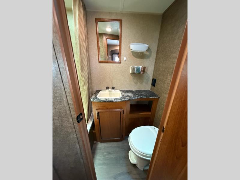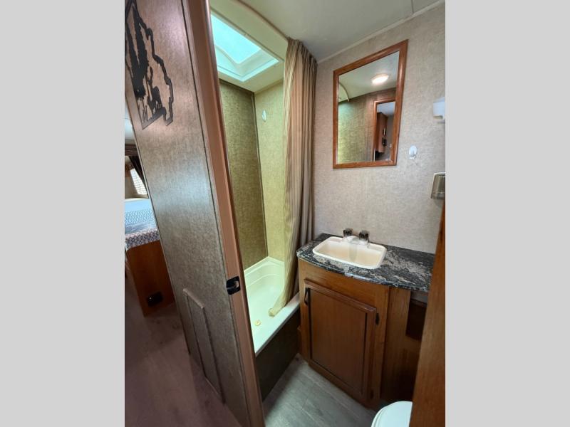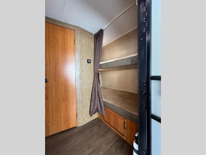 Step inside and see the bunk beds up front. Almost straight in from the door find the bathroom which features a tub/shower, toilet, and vanity with sink.