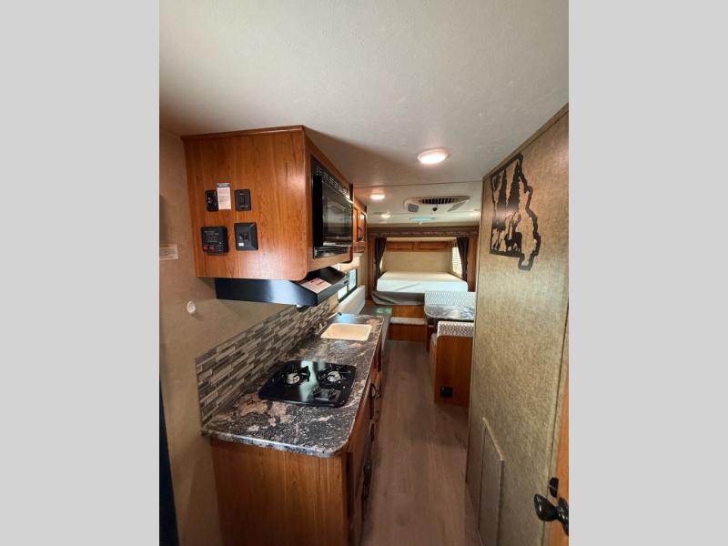 To the left of the door you can do some light cooking on the two burner cook-top with microwave oven above. There is also a single sink, plus overhead cabinets too. The refrigerator is located opposite the sink along the road side wall.