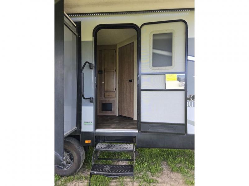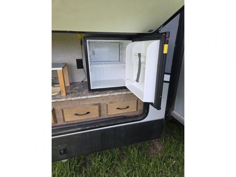 Before you enter, you will notice the outside kitchen near the rear of the trailer. There is a refrigerator, sink, plus counter space for preparing and serving meals outdoors. You are sure to enjoy the shade from the awning as well.