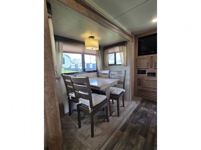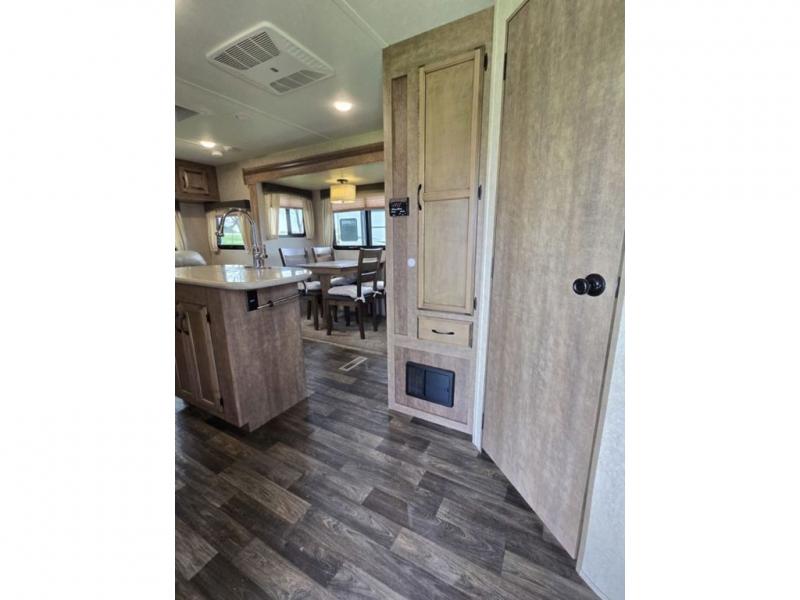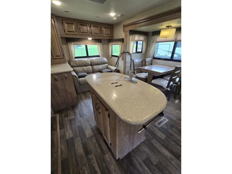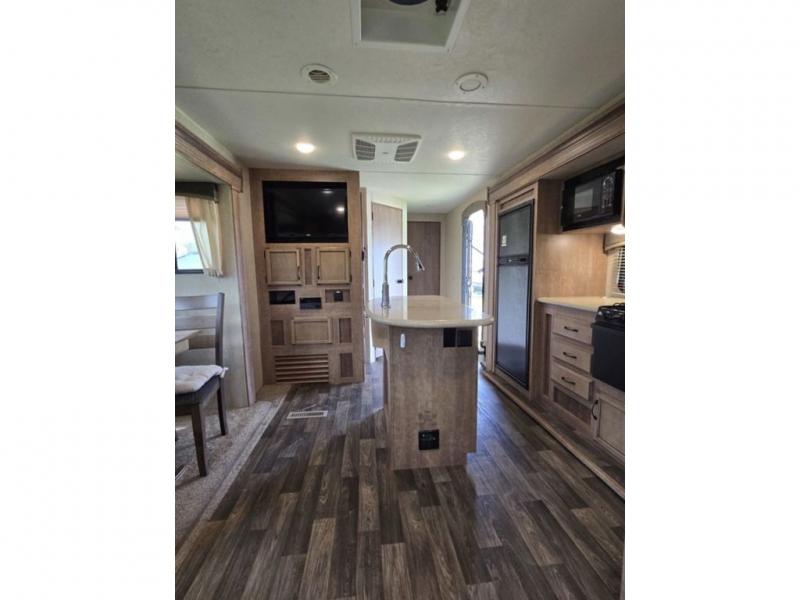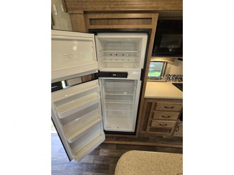 Heading back towards the rear of the trailer, a slide out along the curb side wall includes a refrigerator, microwave, and three burner range. On the opposite slide out, you can eat your meals at the booth dinette, relax, and even sleep at night. A center kitchen island provides a double sink and additional counter space when needed. Along the rear wall, the hide-a-bed sofa faces the entertainment center along the interior wall. A handy pantry provides space for your camping dry goods.